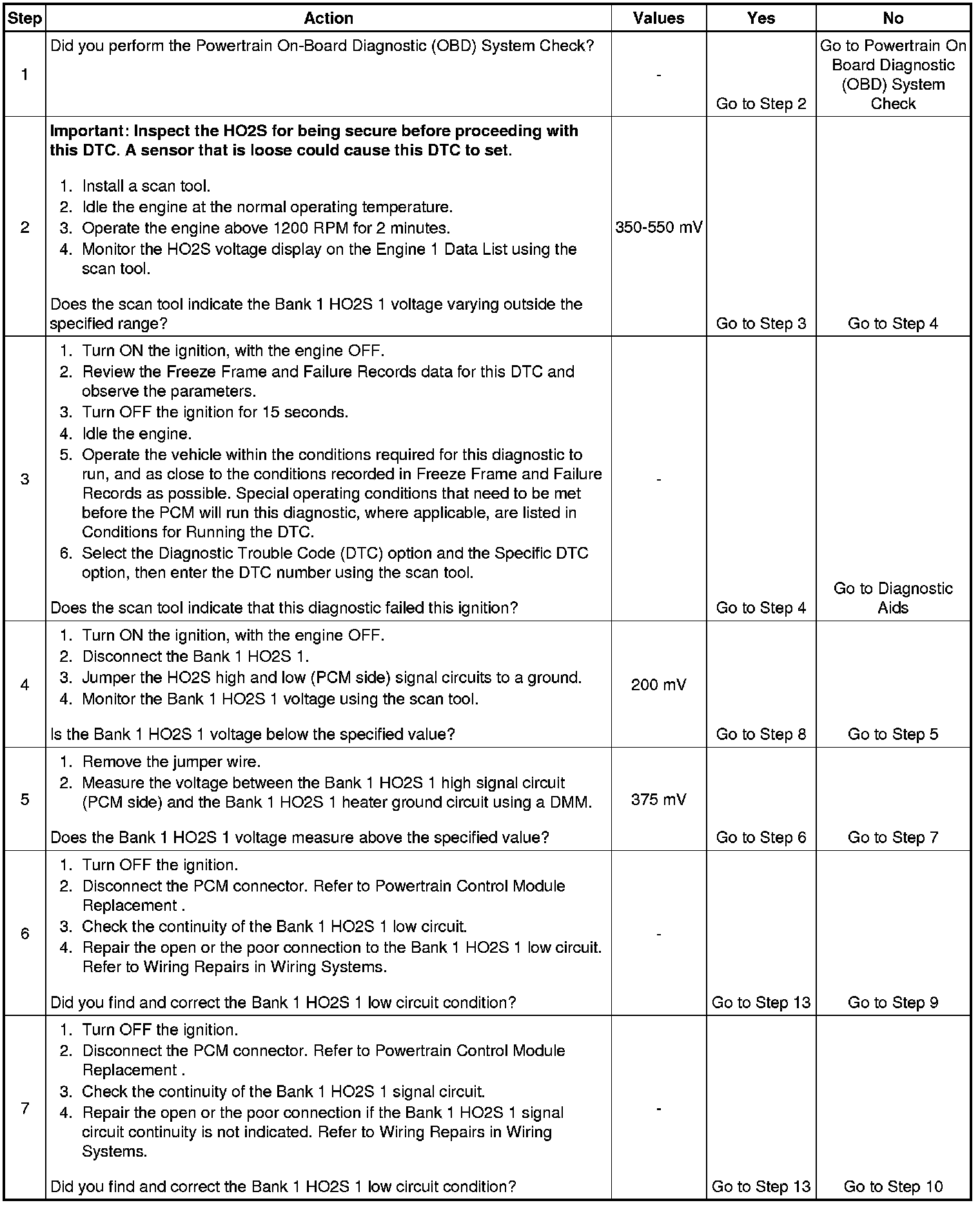 The powertrain control module (PCM) supplies a voltage of about 450 mV between the heated oxygen sensor (HO2S) high and low signal circuits. The oxygen sensor varies the voltage over a range from about 1000 mV when the exhaust is rich, down through about 10 mV when the exhaust is lean.