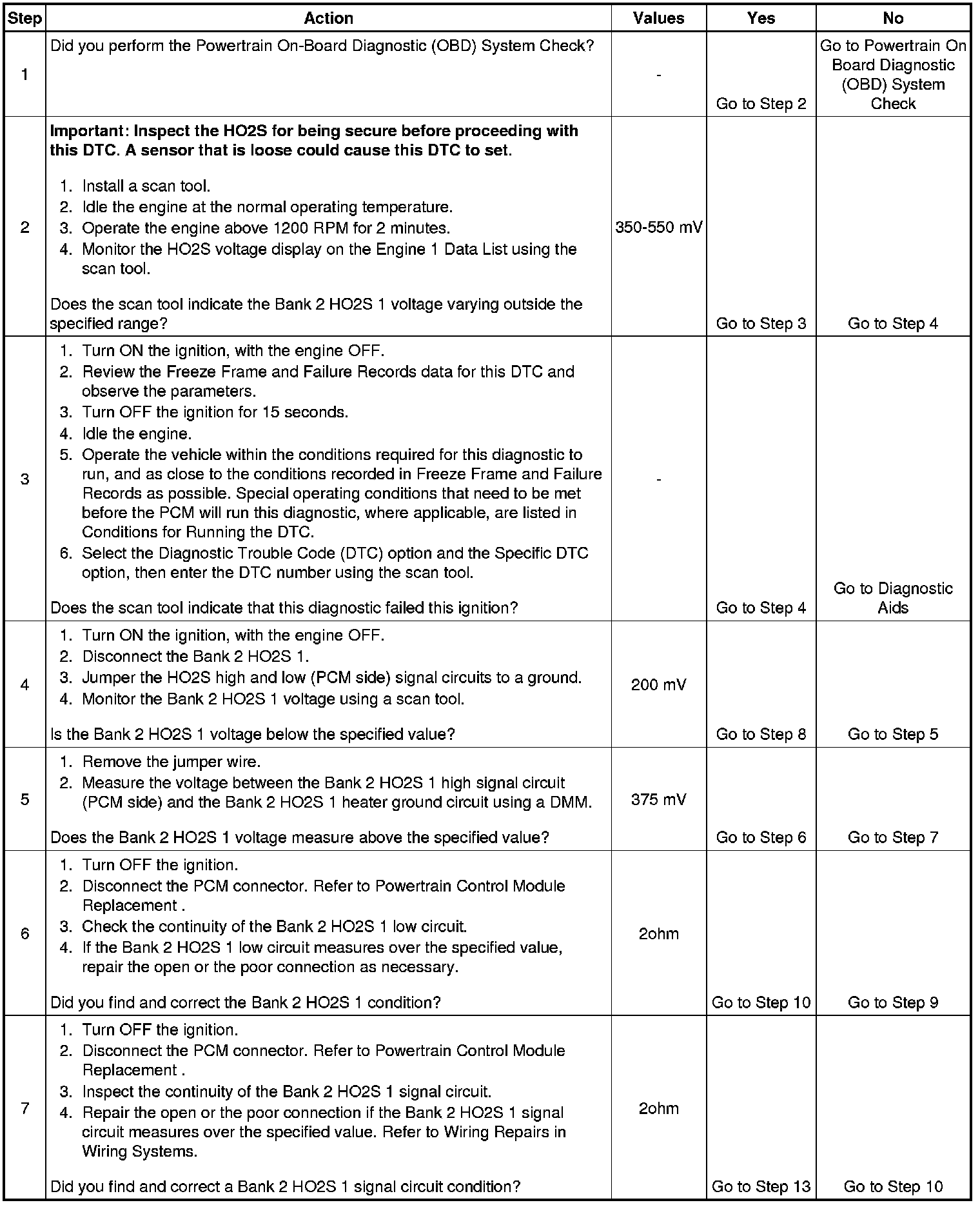 The powertrain control module (PCM) supplies a voltage of about 450 mV between the heated oxygen sensor (HO2S) high and low signal circuits. The oxygen sensor varies the voltage over a range from about 1000 mV when the exhaust is rich, down through about 10 mV when the exhaust is lean.