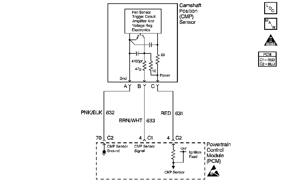 The camshaft position sensor is mounted through the top of the engine block at the rear of the valley cover. The CMP sensor works in conjunction with a 1X reluctor wheel on the camshaft. The reluctor wheel is inside the engine immediately in front of the rear cam bearing. The powertrain control module (PCM) provides a 12 volt power supply to the CMP sensor as well as a ground and a signal circuit.