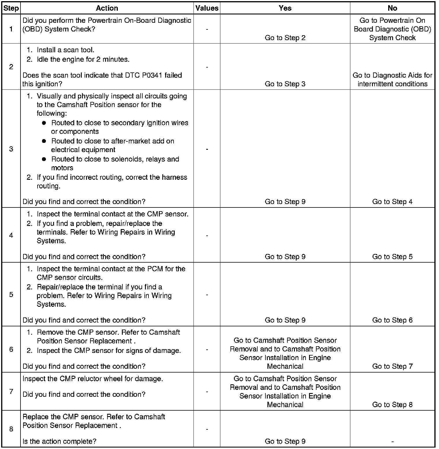 7. Damage to the reluctor wheel would affect the CMP sensor output. If this condition exists, refer to Camshaft Replacement Service and Repair in Engine Mechanical.