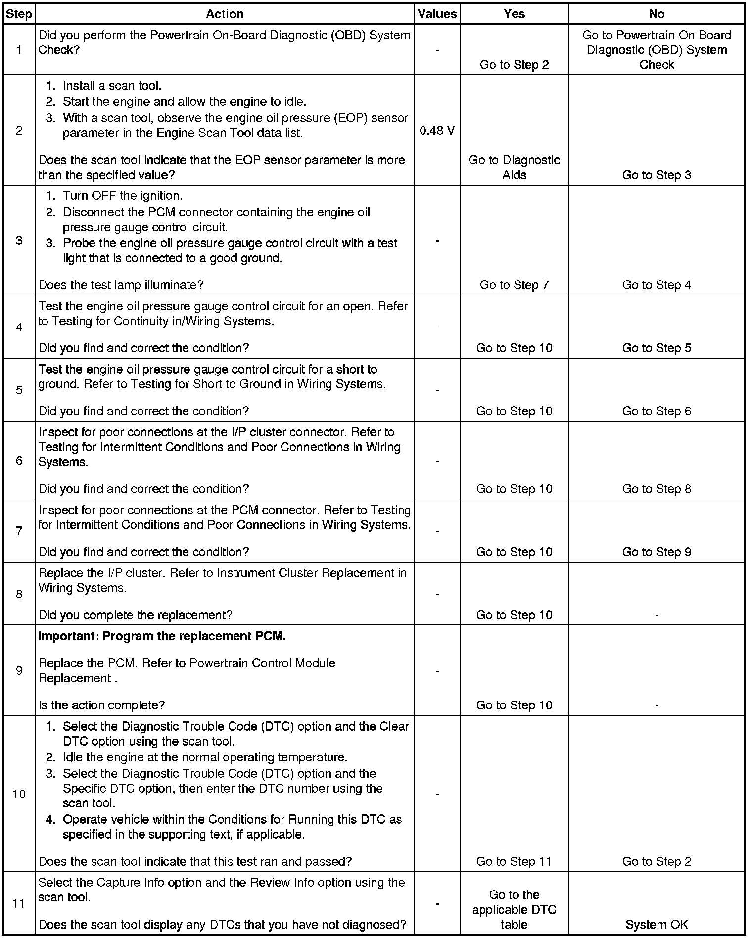The engine oil pressure (EOP) gauge supplies ignition positive voltage to the powertrain control module (PCM) by way of the EOP gauge control circuit. The EOP signal is sent to the PCM from the engine oil pressure sensor. The PCM controls the EOP gauge by momentarily grounding the EOP gauge control circuit and causing the voltage to pulse. The solid state circuits of the EOP gauge convert the voltage pulses in order to drive the gauge pointer and display EOP in pounds per square inch (PSI).