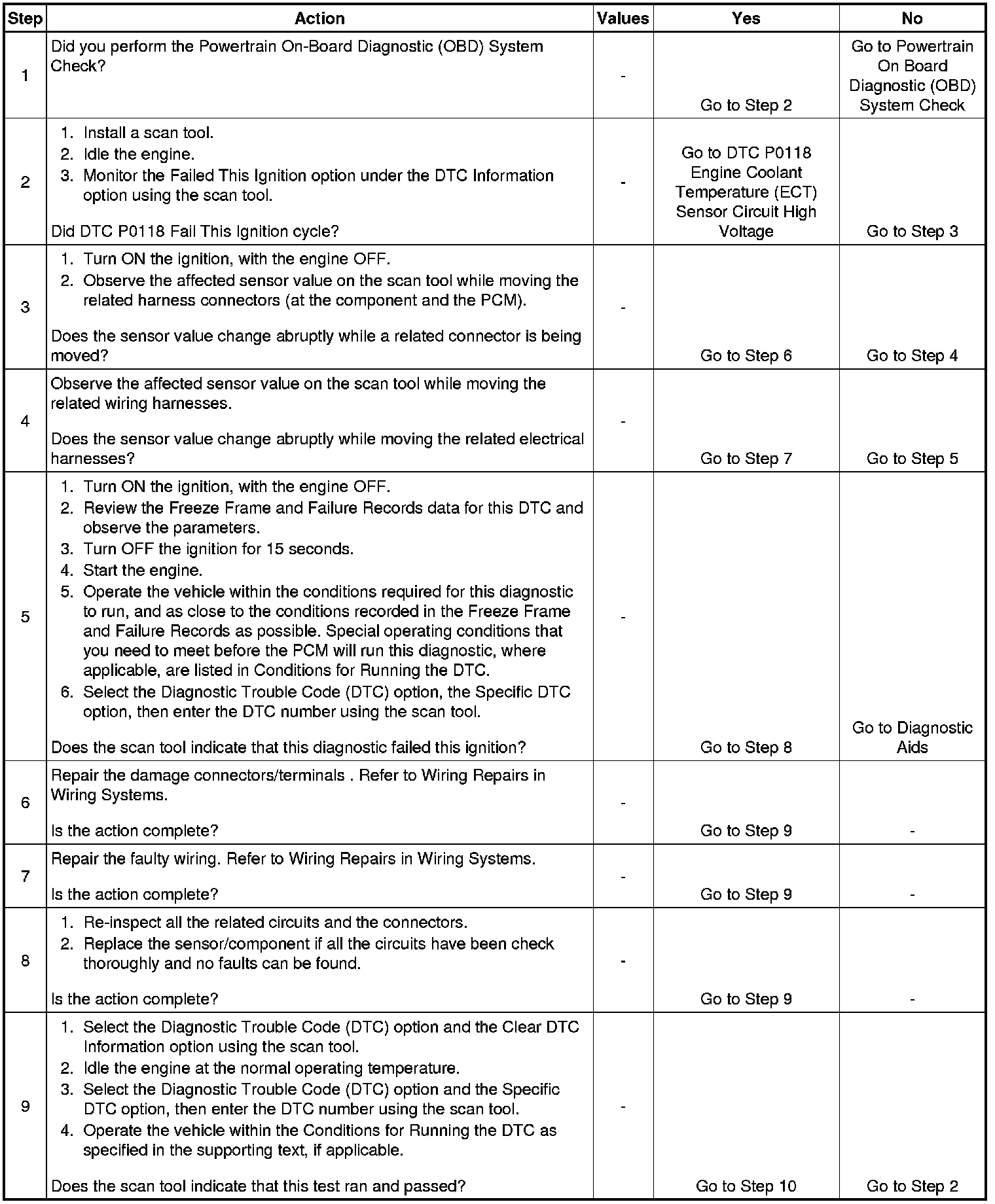 2. If DTC P0118 failed this ignition, this indicates a hard failure is present. When a hard failure is present, both the hard and intermittent DTCs set.