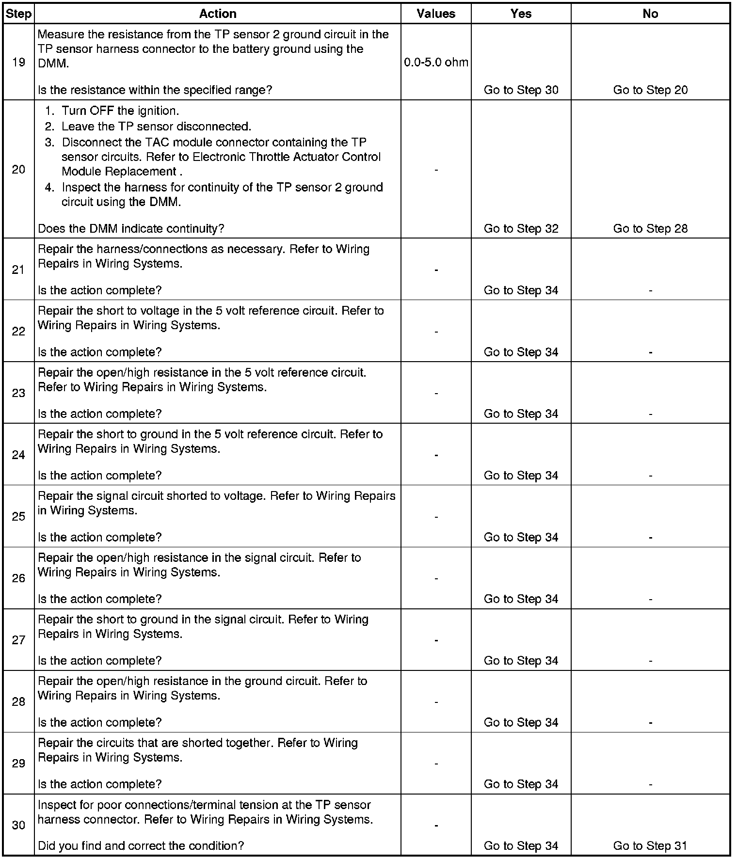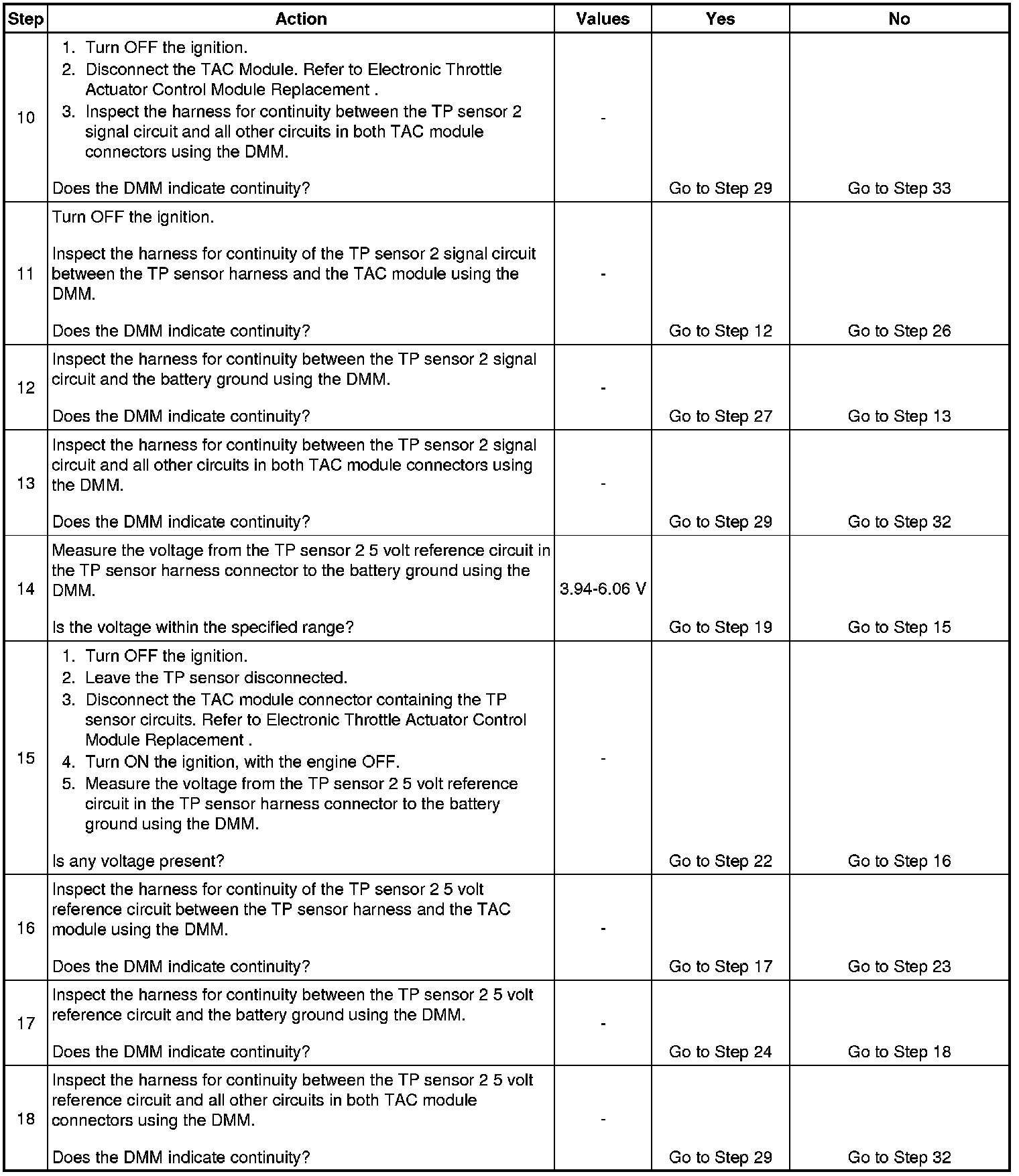 10. The previous step found no voltage present on the signal circuit with the TP sensor harness disconnected at both ends. This rules out a short to voltage from outside the TAC System. This test isolates whether the short is to another TAC System circuit in the harness or within the TAC module.