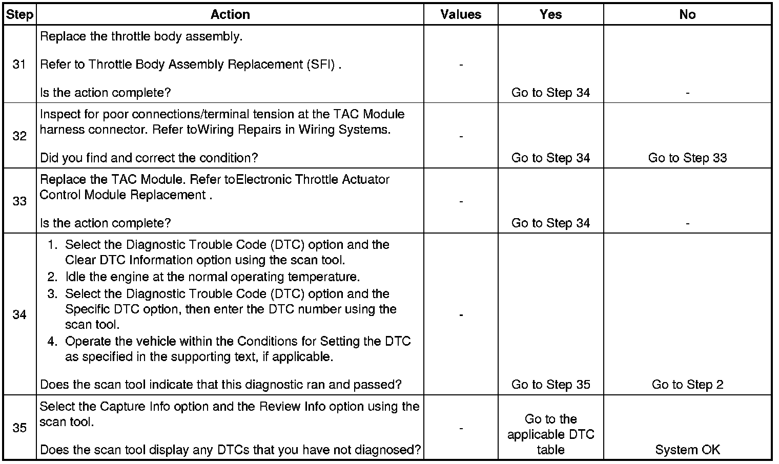 35. When the TAC module detects a problem within the TAC System, more than one TAC System related DTC may set. This is due to the many redundant tests run continuously on this system. Locating and repairing one individual problem may correct more than one DTC. Keep this in mind when reviewing captured DTC info.