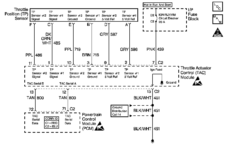 The throttle position (TP) sensor is mounted on the air control valve assembly (throttle body). The sensor is actually 2 individual TP sensors within 1 housing. Two separate signal, ground and 5 volt reference circuits are used to connect the TP sensor assembly and the throttle actuator control (TAC) module. The 2 sensors have opposite functionality. The TP sensor 1 signal voltage increases as the throttle opens, from below 1.1 volts at 0 percent throttle to above 3.7 volts at 100 percent throttle. The TP sensor 2 signal voltage decreases from above 3.9 volts at 0 percent throttle to below 1.2 volts at 100 percent throttle. Observe also that the signal circuit for TP sensor 1 is pulled up to 5.0 volts and that the signal circuit for TP sensor 2 is pulled to ground within the TAC module. The TAC module converts these different signals to a common scale and continuously compares them to each other to verify proper system operation.