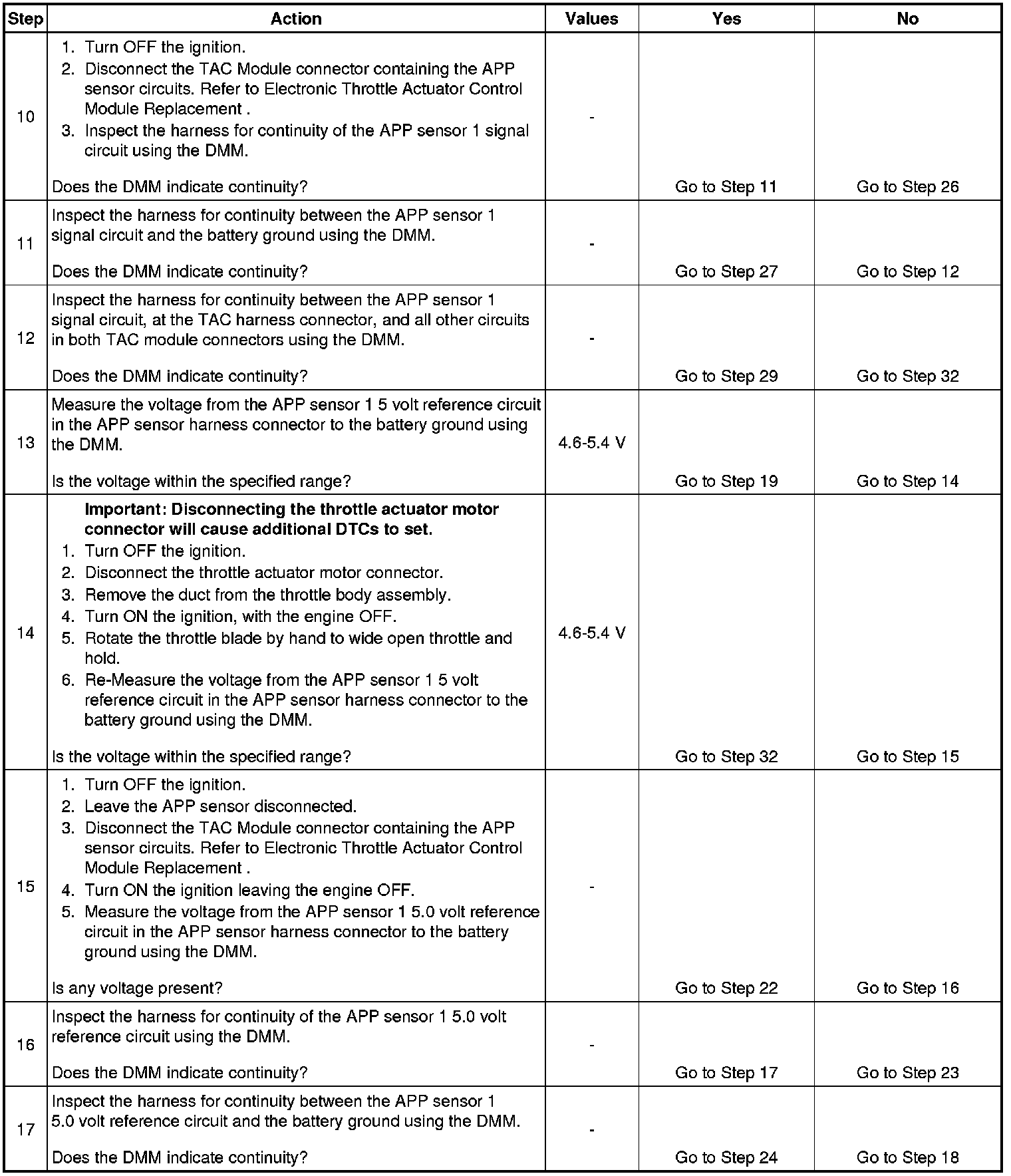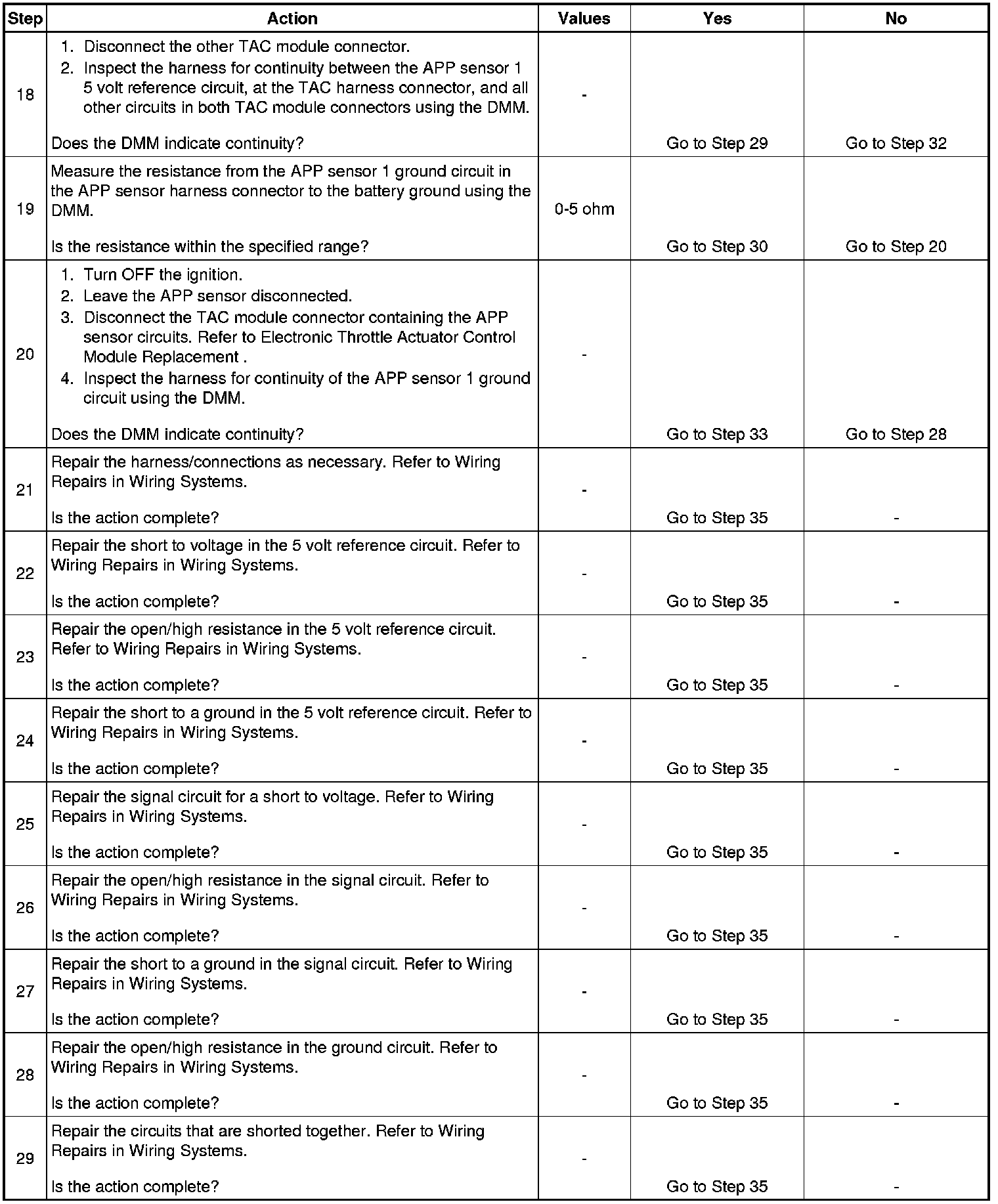 * The APP and TP sensor 5 volt reference circuits are internally connected within the TAC. Inspect the 5 volt reference circuits at the APP and the TP sensors for an open, a ground, or a short to a voltage. TP and APP sensor DTCs will set.