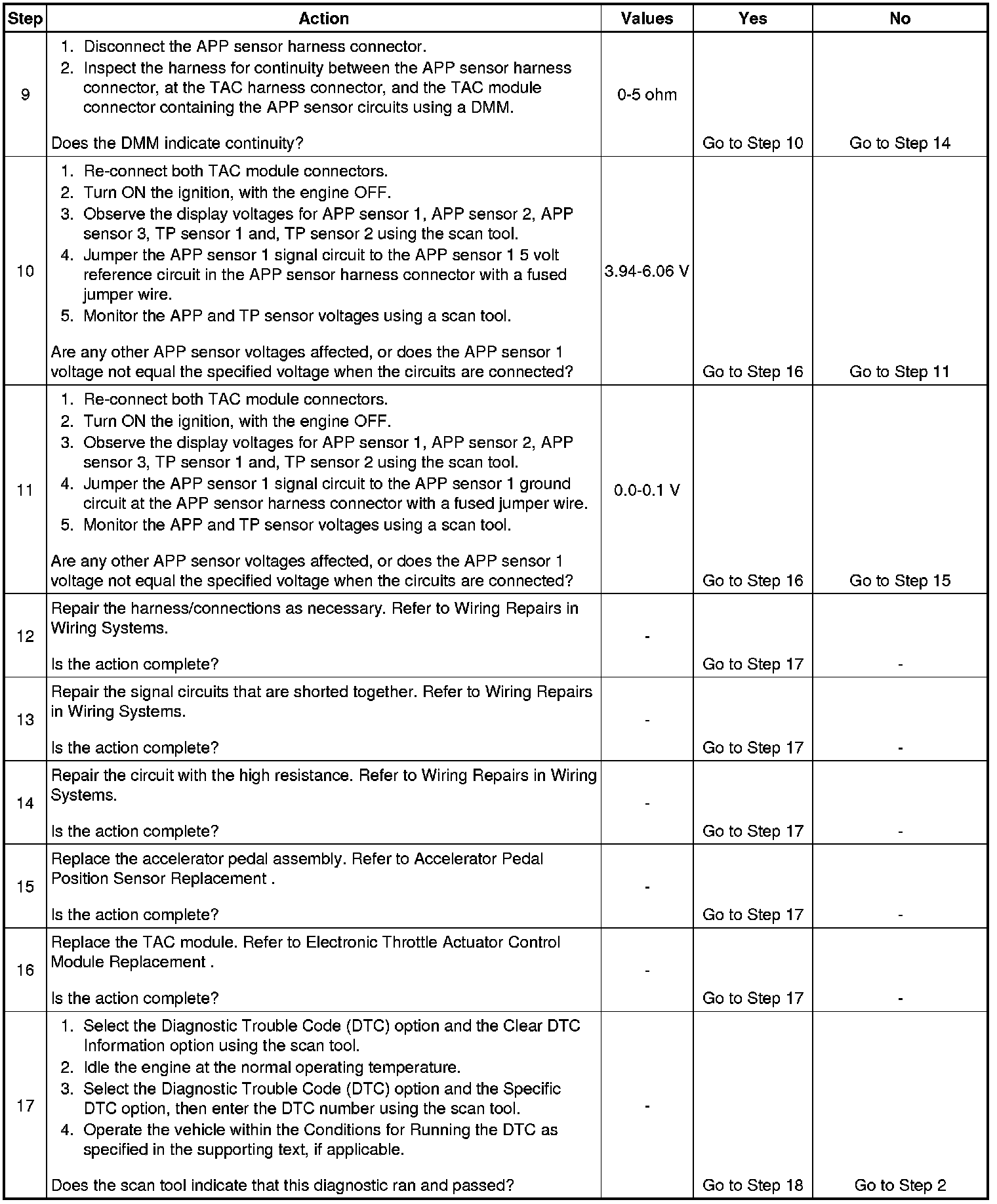 10. Jumping one APP sensor signal circuit to 5 volts should not affect any of the other APP sensor voltages. A problem exists within the TAC module if jumping the circuits affects another APP parameter.