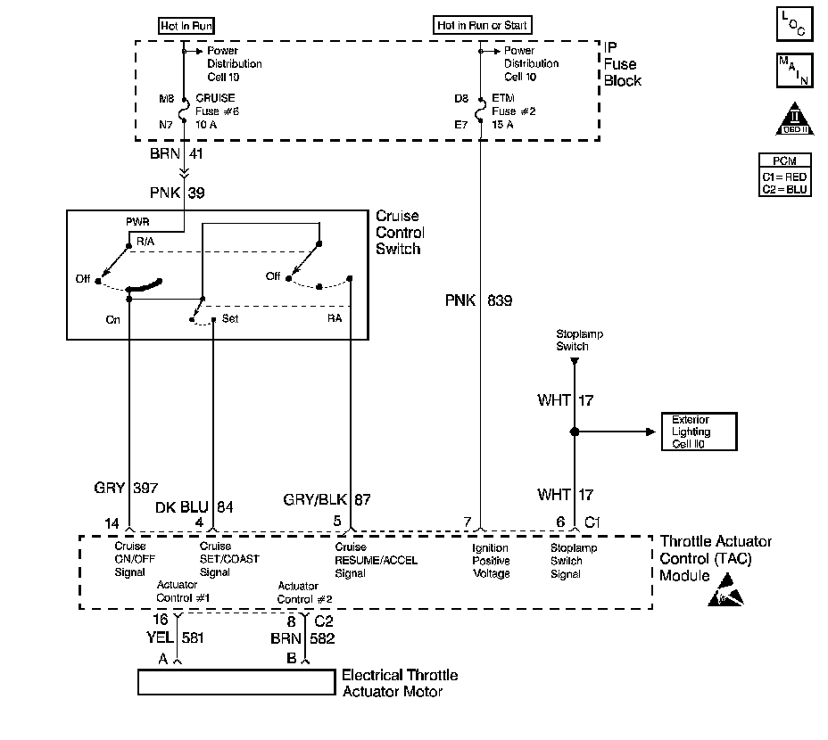 The throttle actuator control (TAC) module controls the cruise system. When the cruise control switch is in the ON position and you push the cruise SET/COAST switch, the TAC module maintains the current vehicle speed. If the engine load varies, the TAC module commands the throttle blade to the appropriate position in order to maintain the desired vehicle speed.