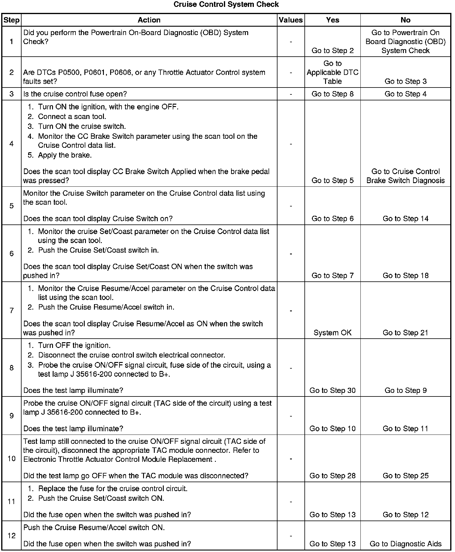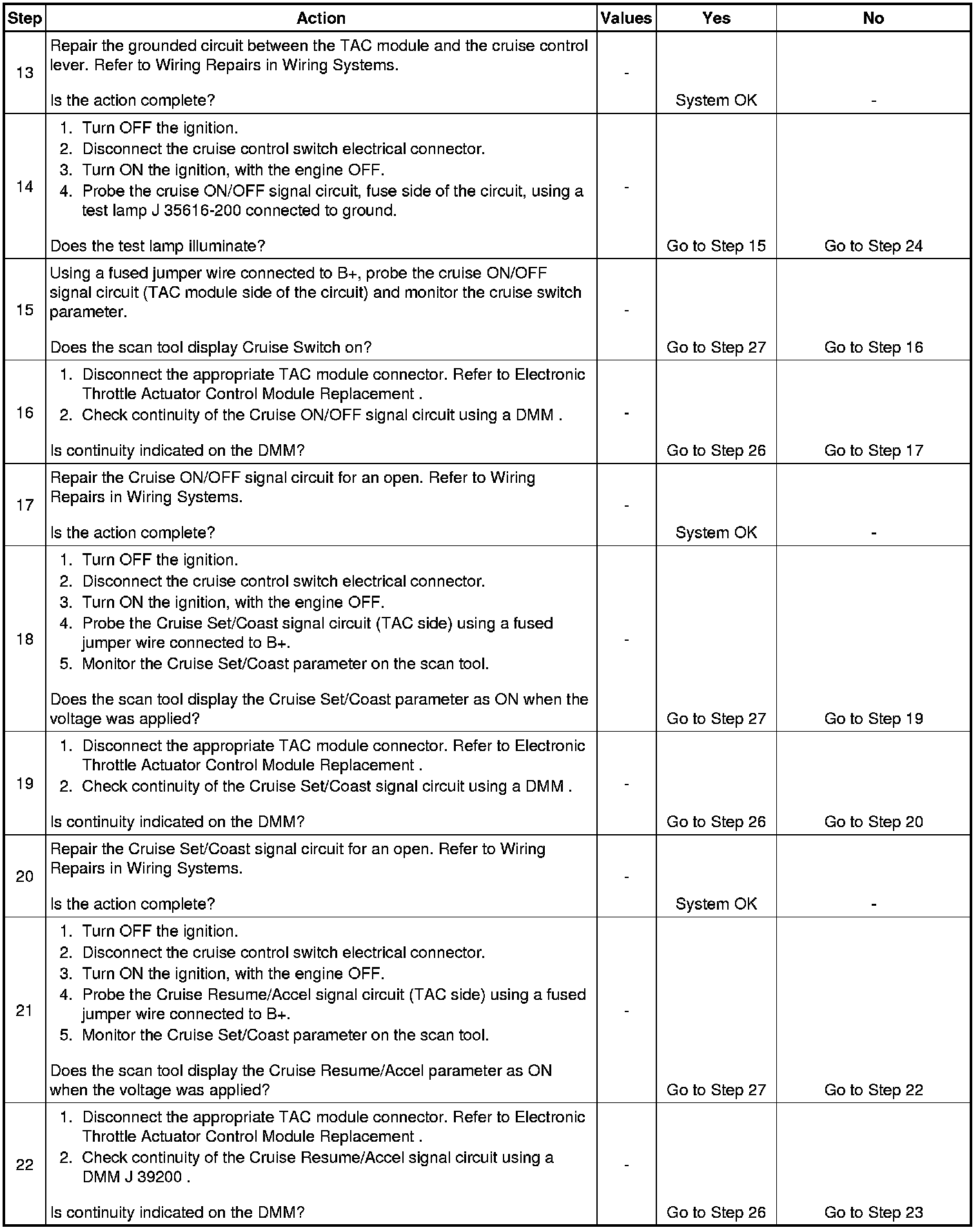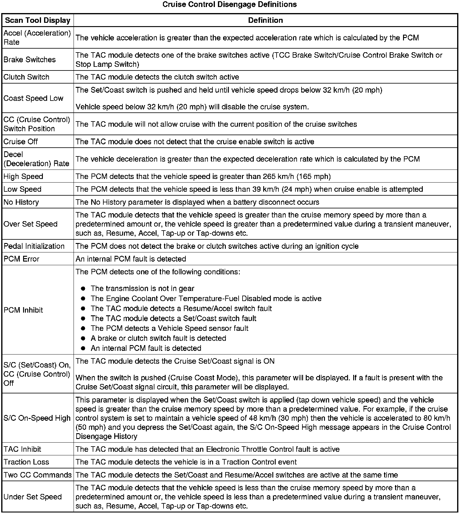 Use the scan tool in order to monitor the Cruise Disengage History. This parameter lists the last 8 cruise disengage events. Refer to Cruise Disengage History table for a description of each condition.