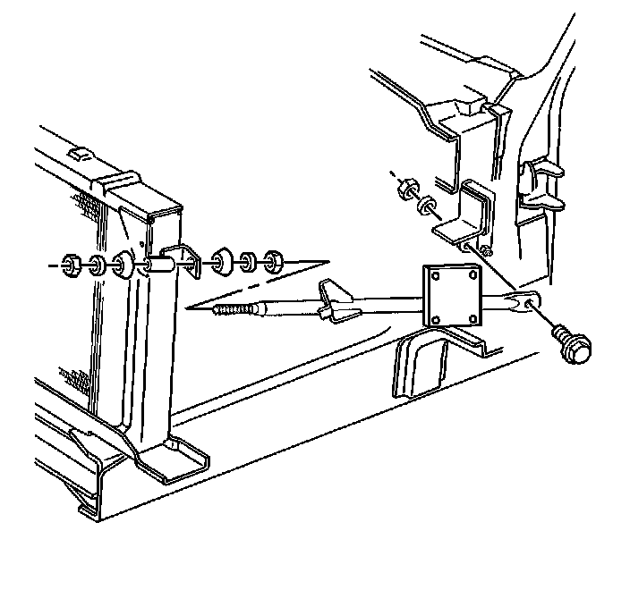 15. Remove the hood hinges from the radiator lower mounting panel. Refer to Hood Replacement Service and Repair in Body Front End.