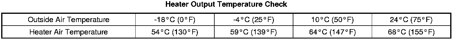 Drive the vehicle when the engine is sufficiently warmed up (after approximately 20 minutes of operation). Drive the vehicle at 48 km/h (30 mph) and use an accurate thermometer in order to determine the temperature of the outside air and the temperature of the air discharged at the floor outlets. Minimum acceptable heater output temperatures, at four different outside air temperatures, are as follows: