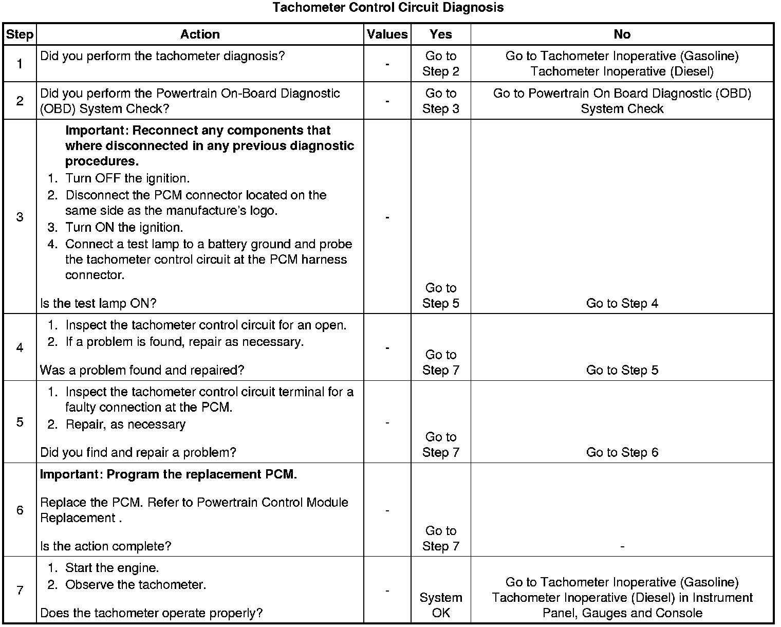 1. The tachometer diagnostic table will direct you back to this diagnostic table if a problem is not found elsewhere in the tachometer circuitry.