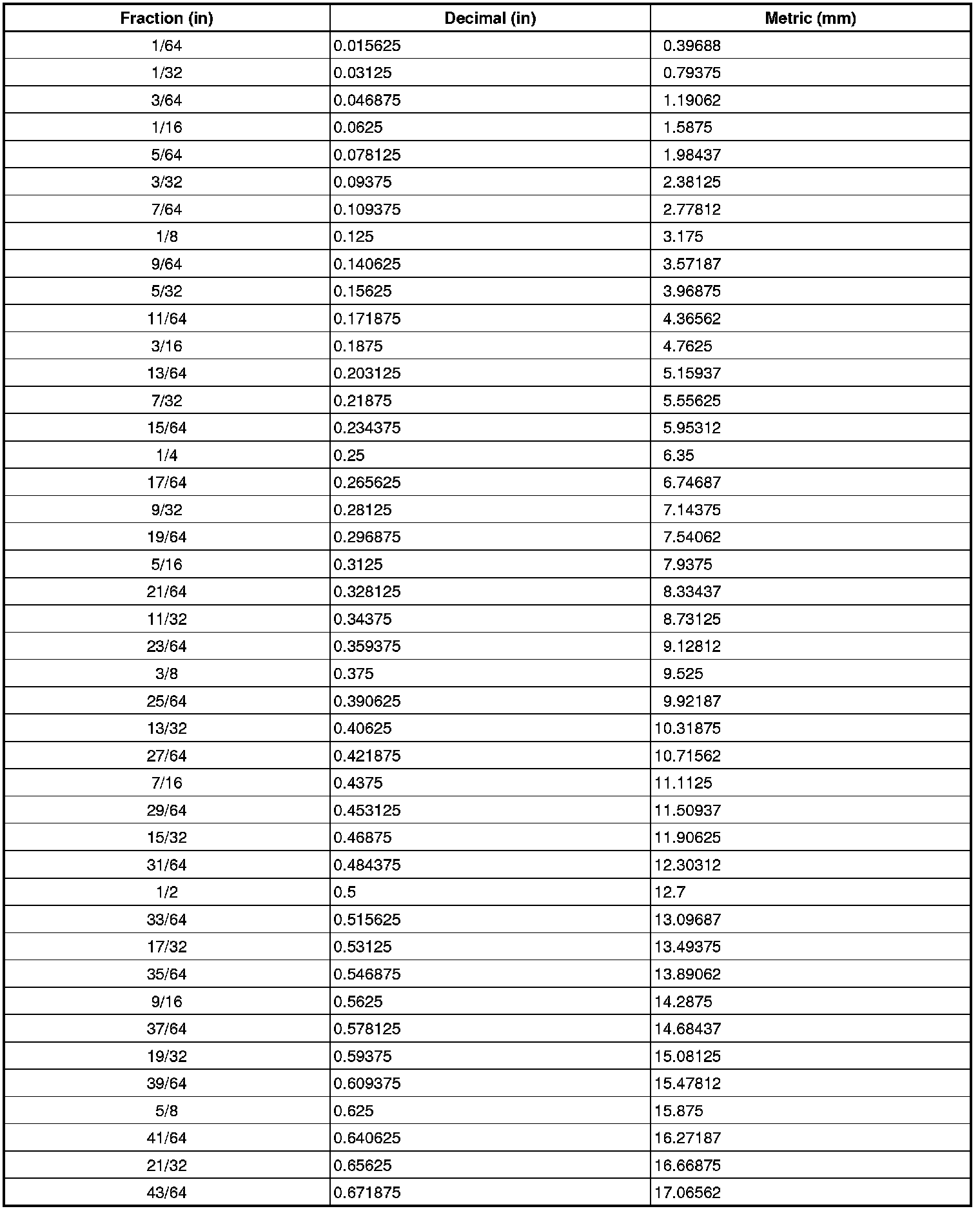 Decimal and Metric Equivalents