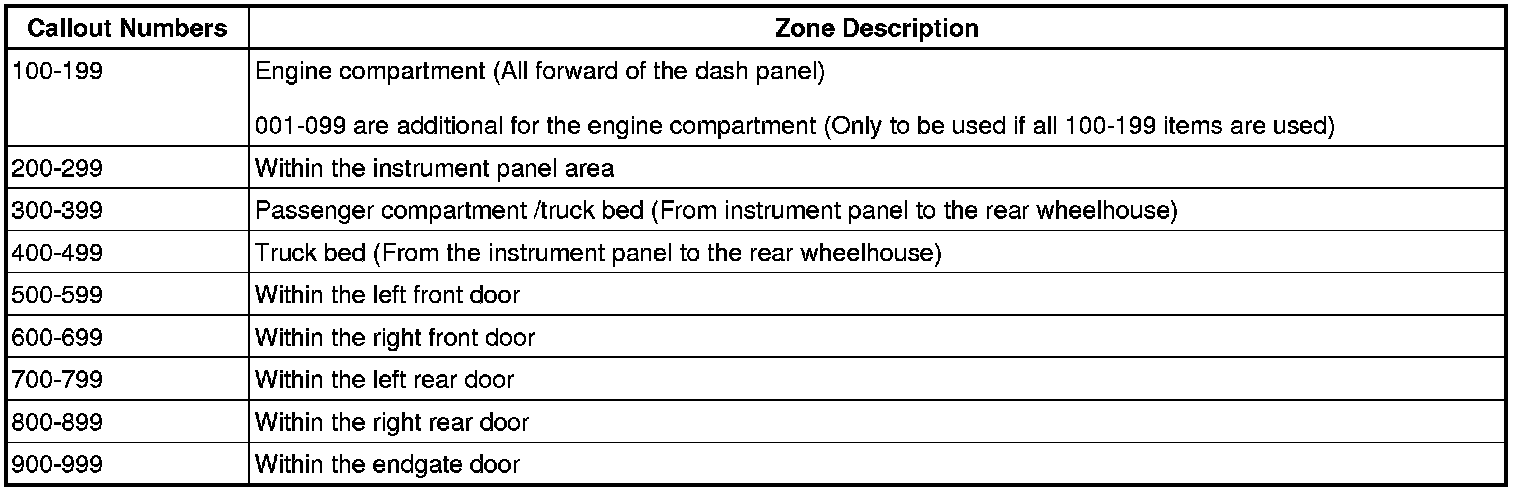 All grounds, in-line connectors, pass-through grommets, and splices have identifying numbers that corresponds to where they are located in the vehicle. The following table explains the numbering system.