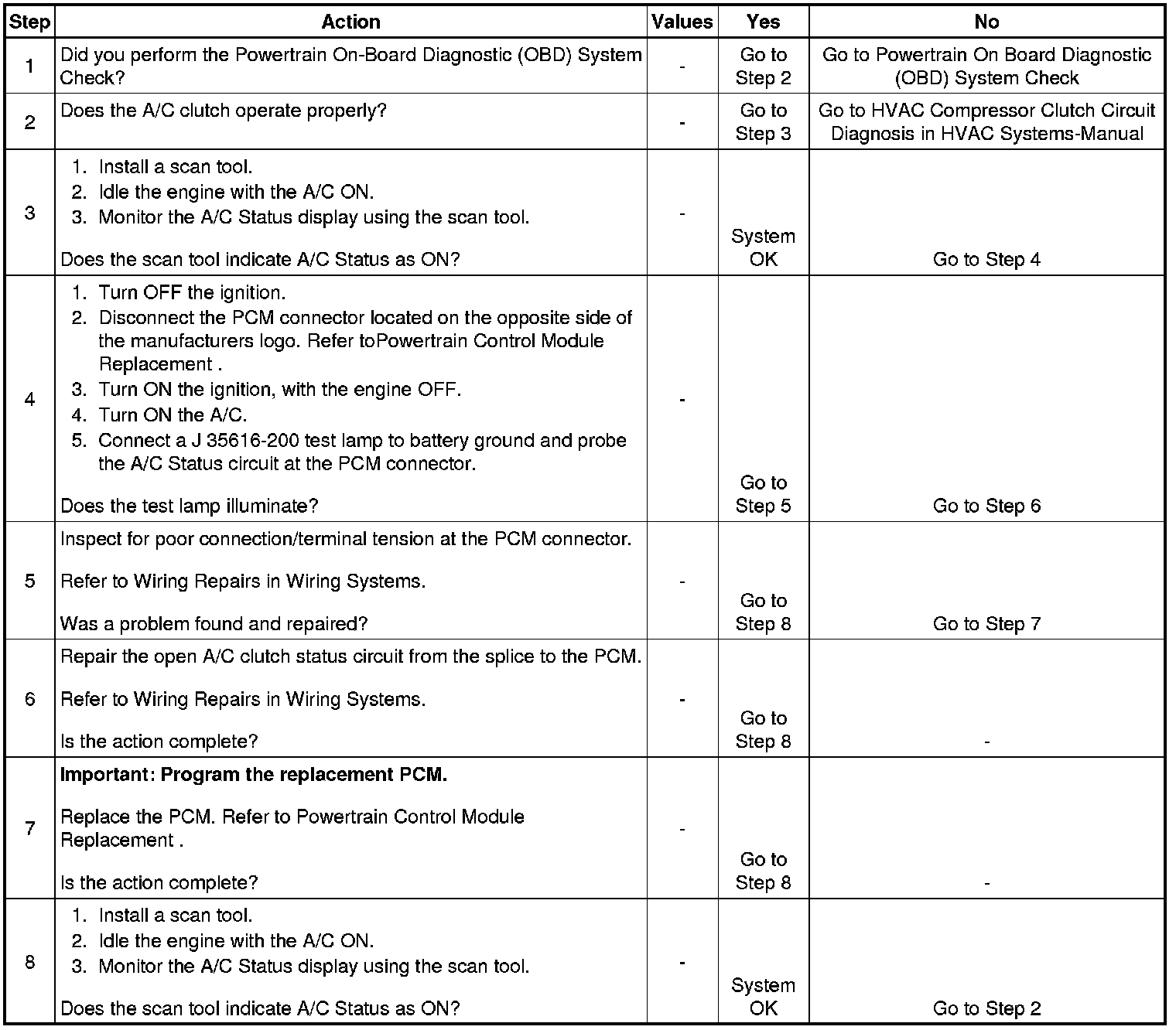 8. This verifies that the A/C Status circuit has been repaired and that the PCM has the ability to determine that the A/C compressor clutch is engaged.