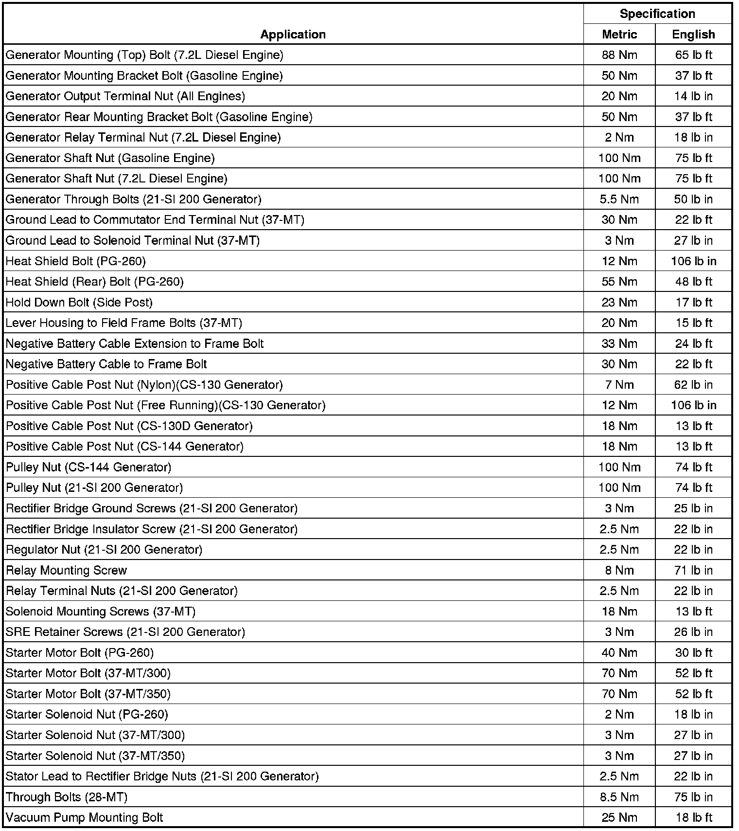 Starting and Charging: Specifications