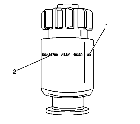 The build date (1) is stamped on the outer shell near the part number (2). The build date uses the following format: