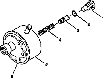 3. Remove the control valve assembly (3) from the pump housing (6). Make sure the flow control spring (4) does not fall out of the pump housing (6).