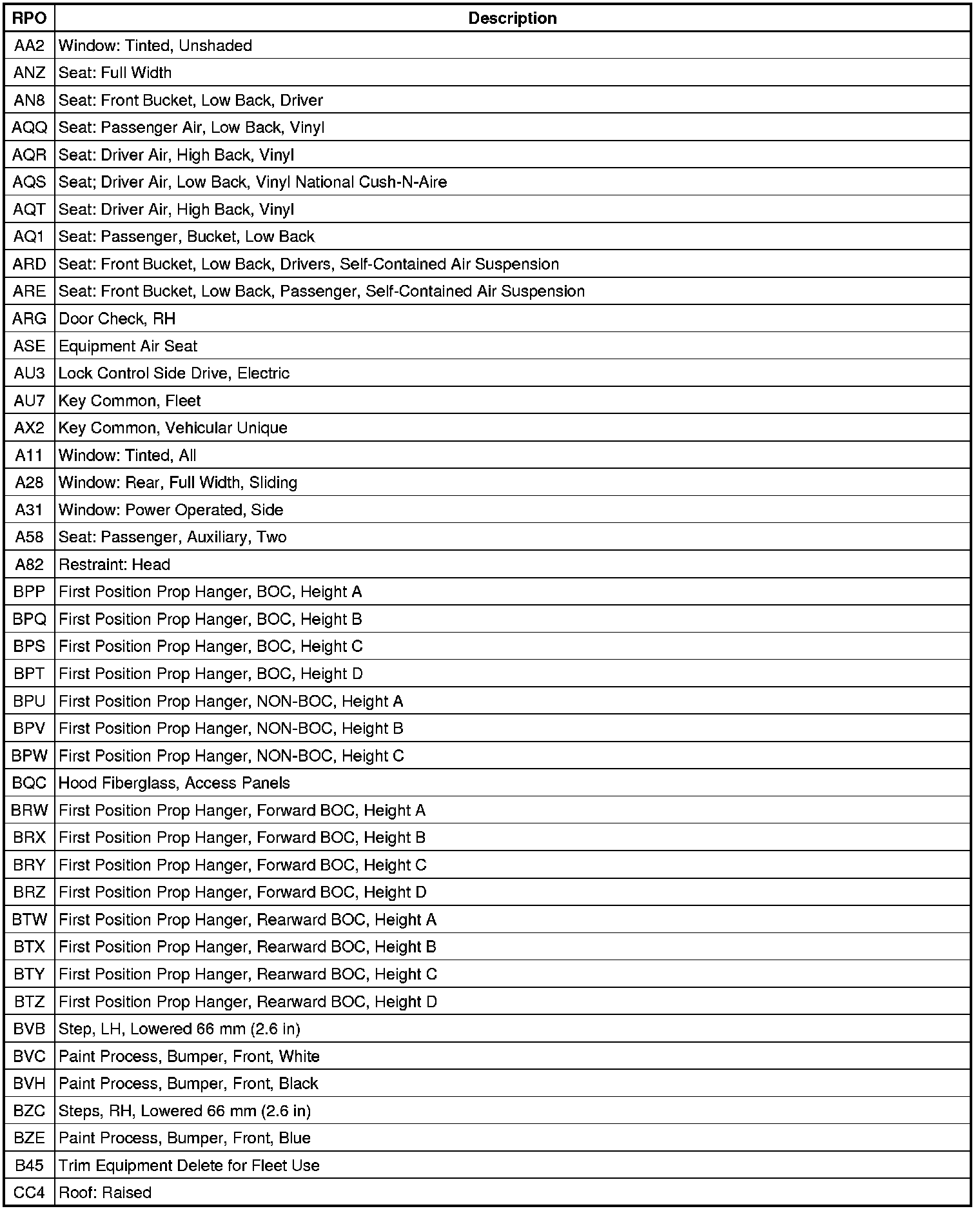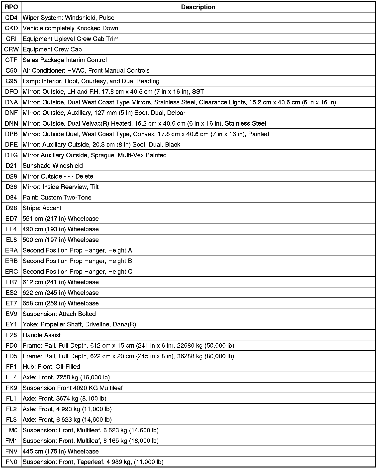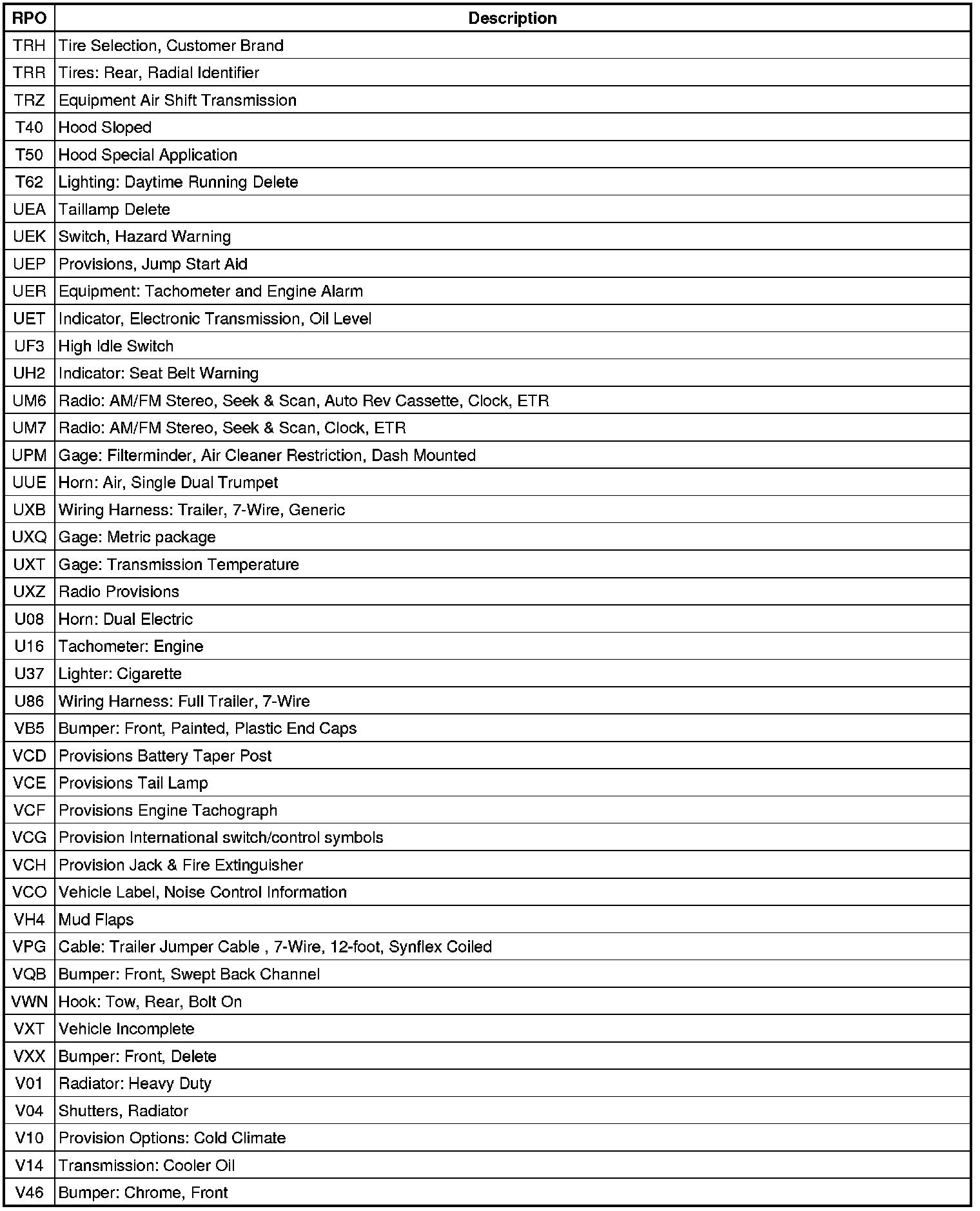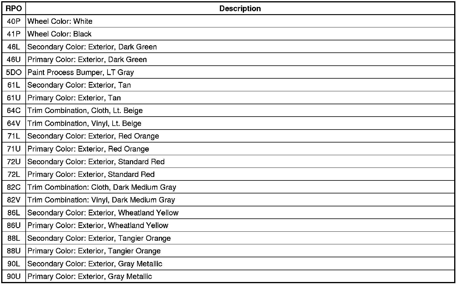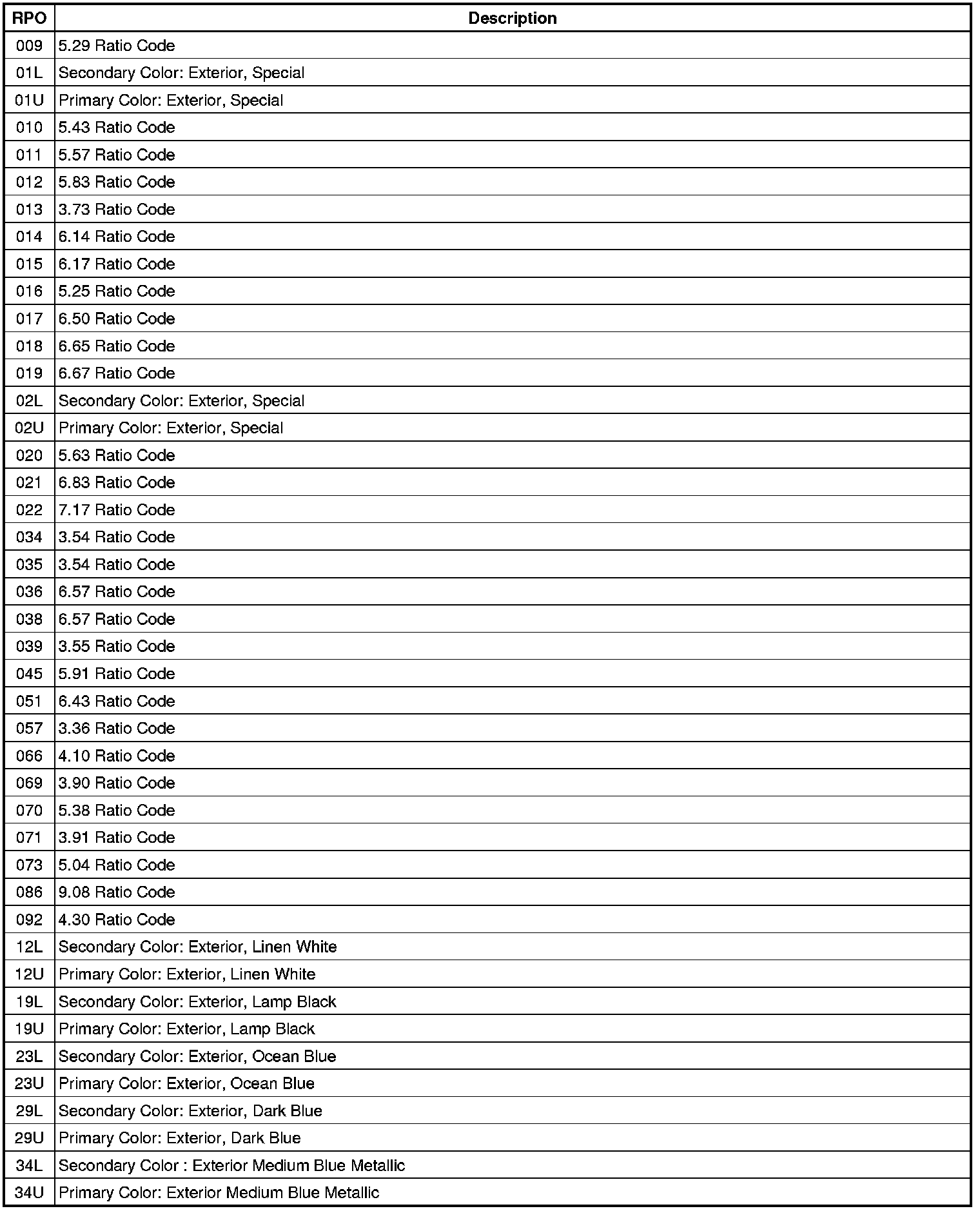 RPO Code List