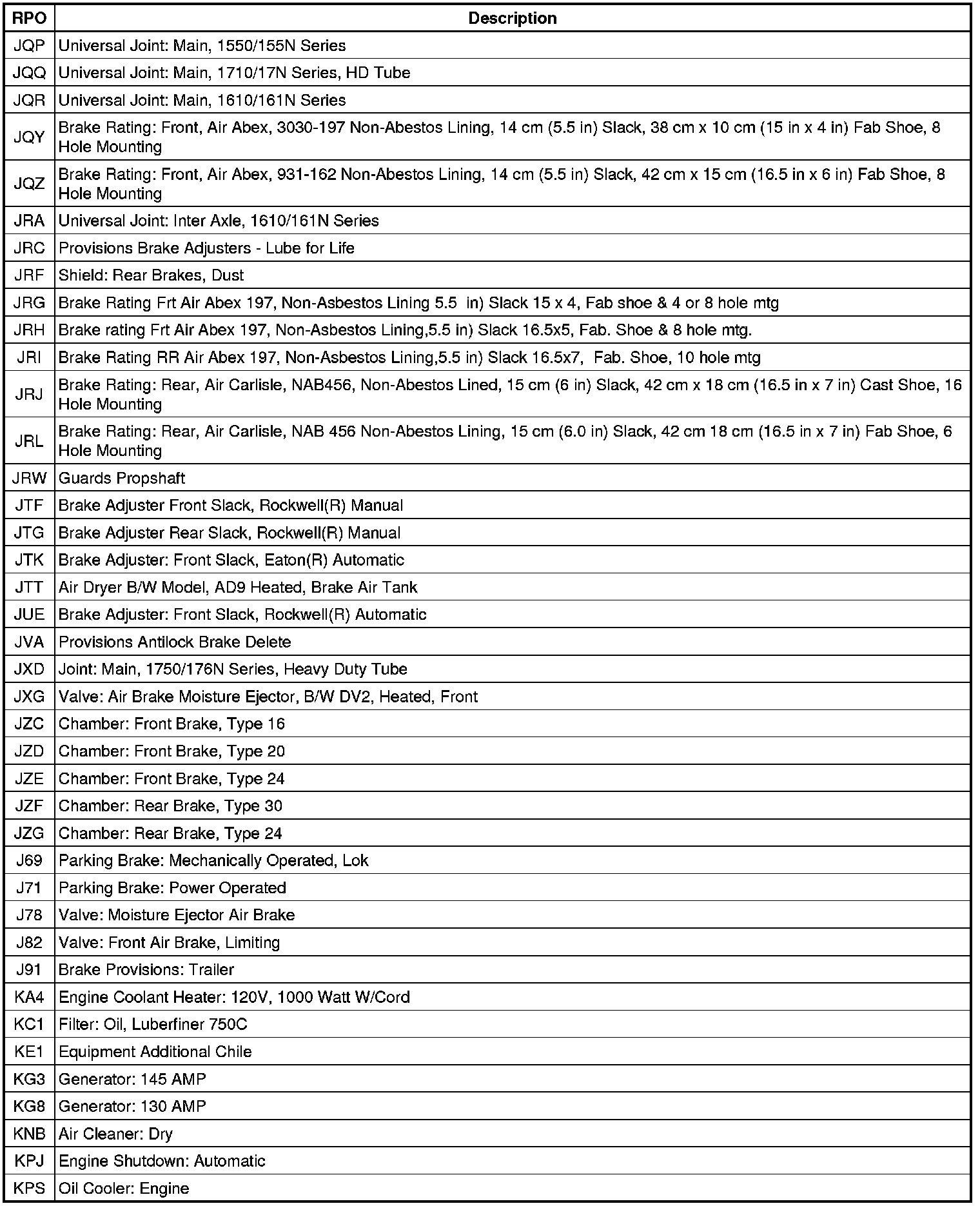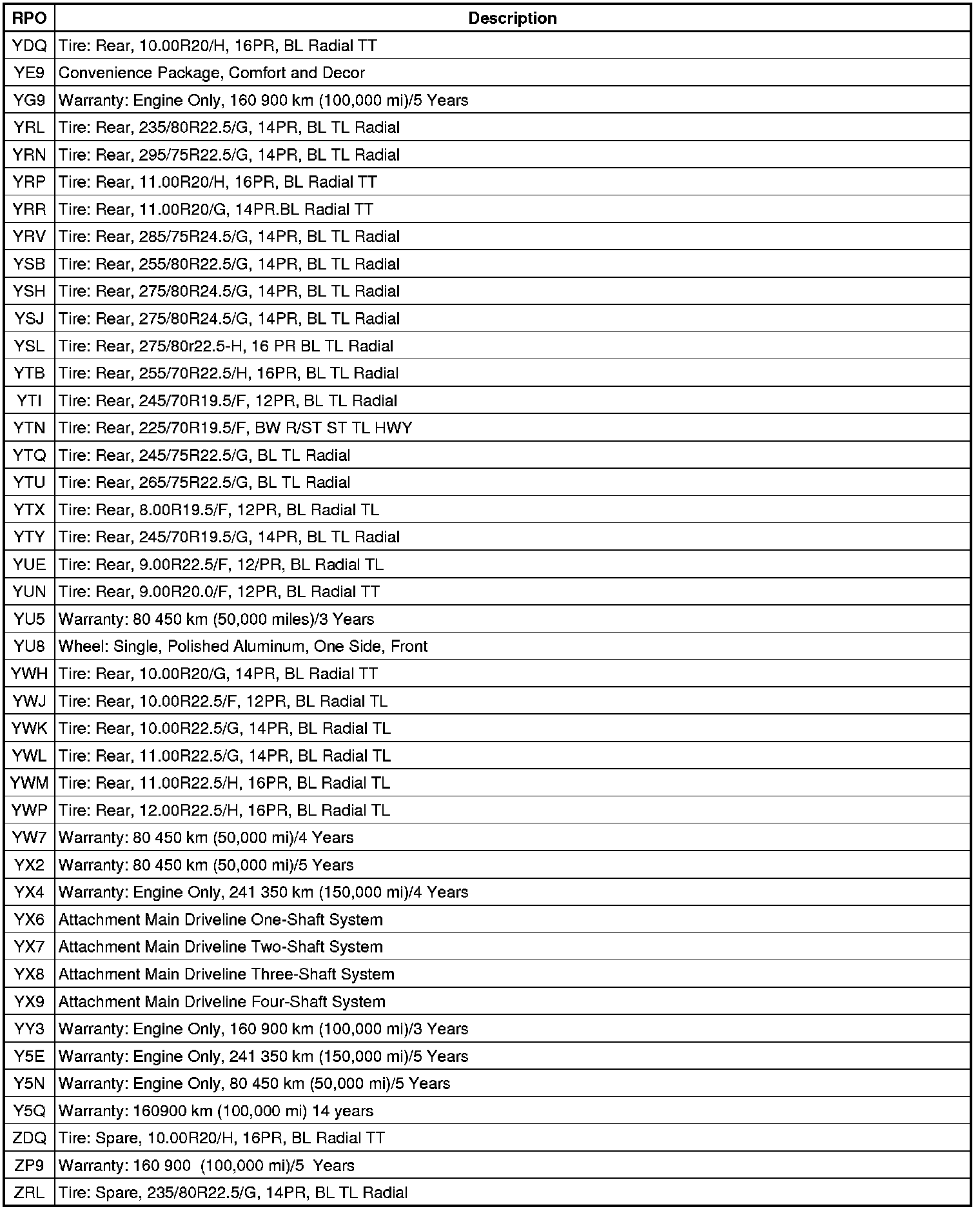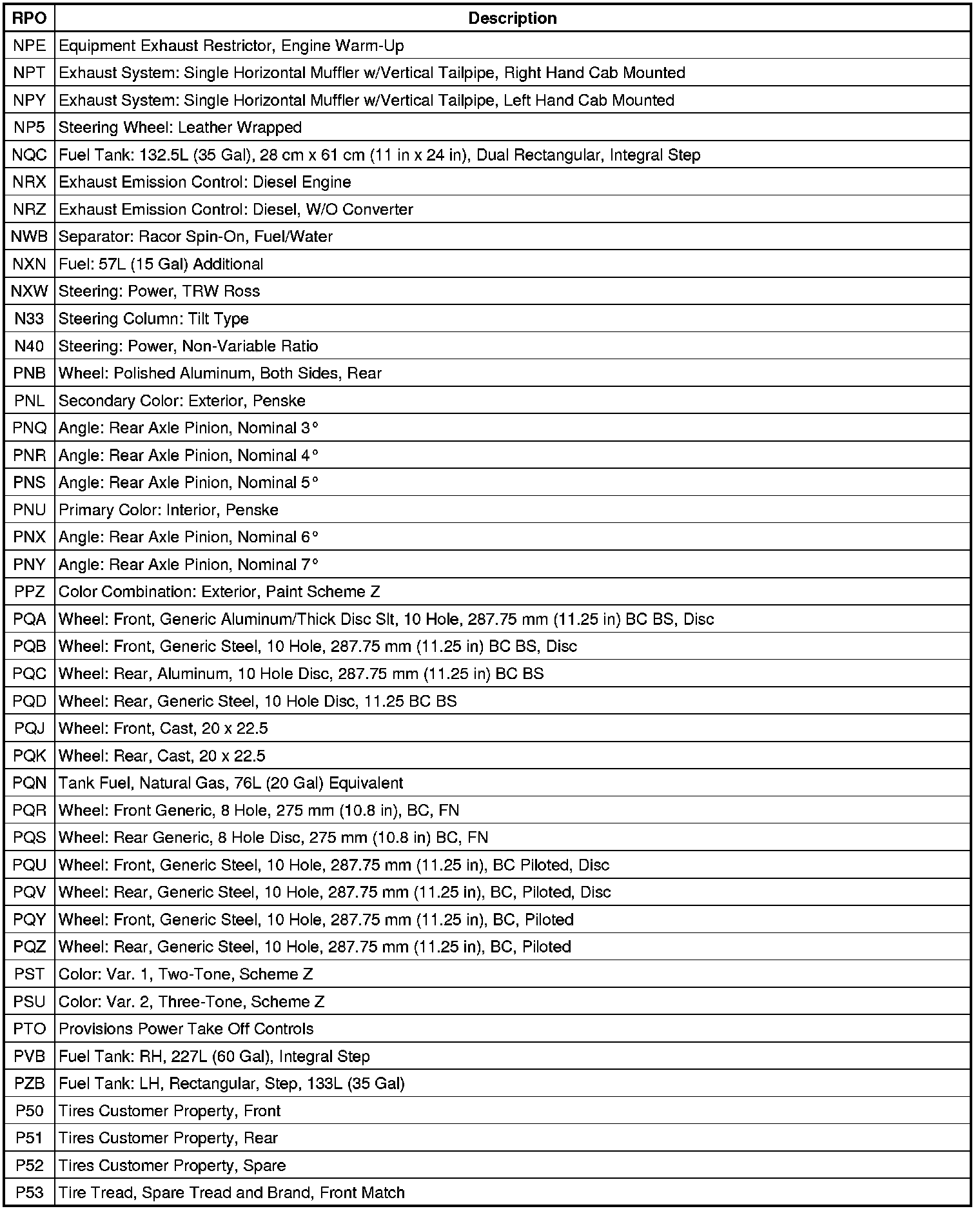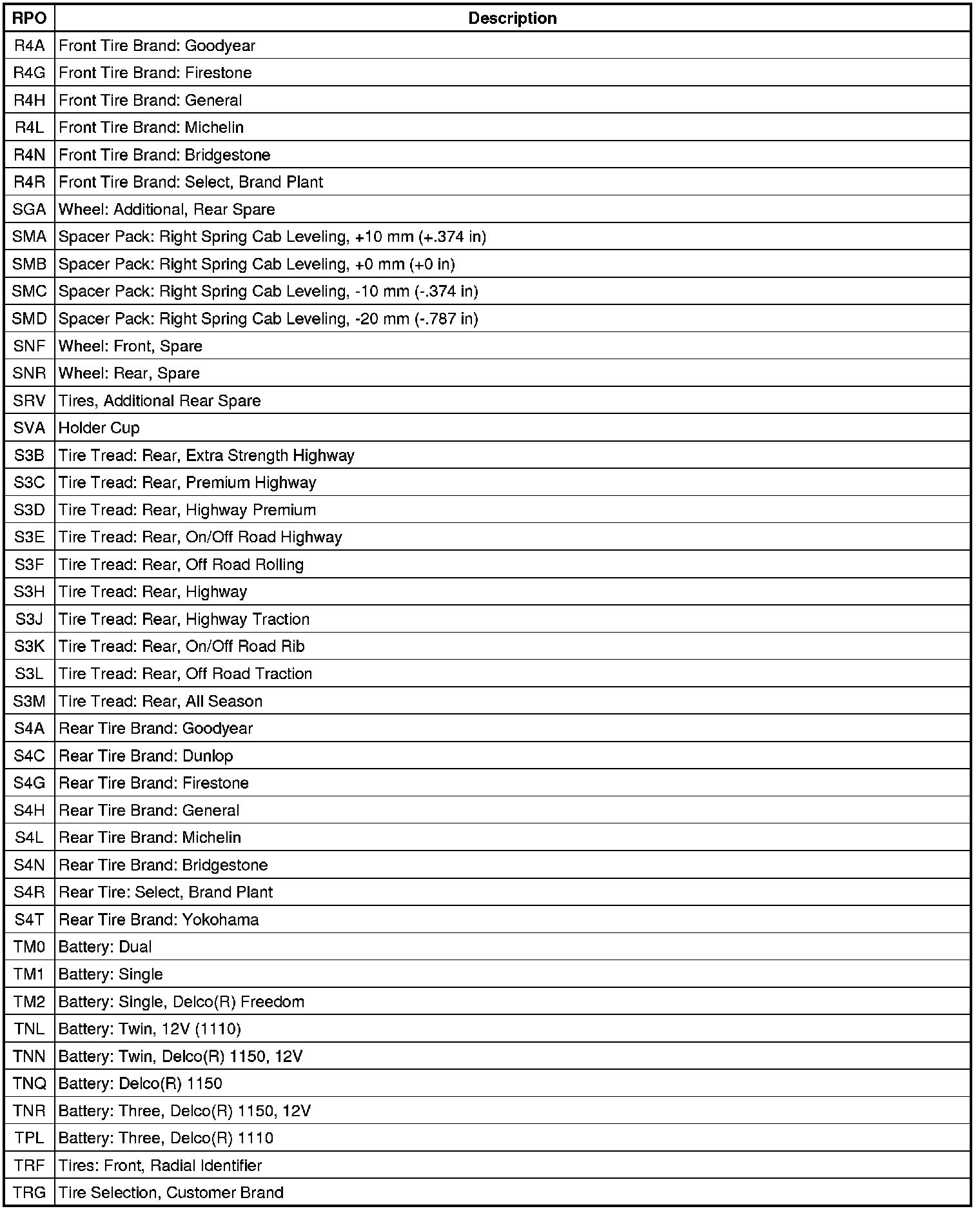 RPO Code List