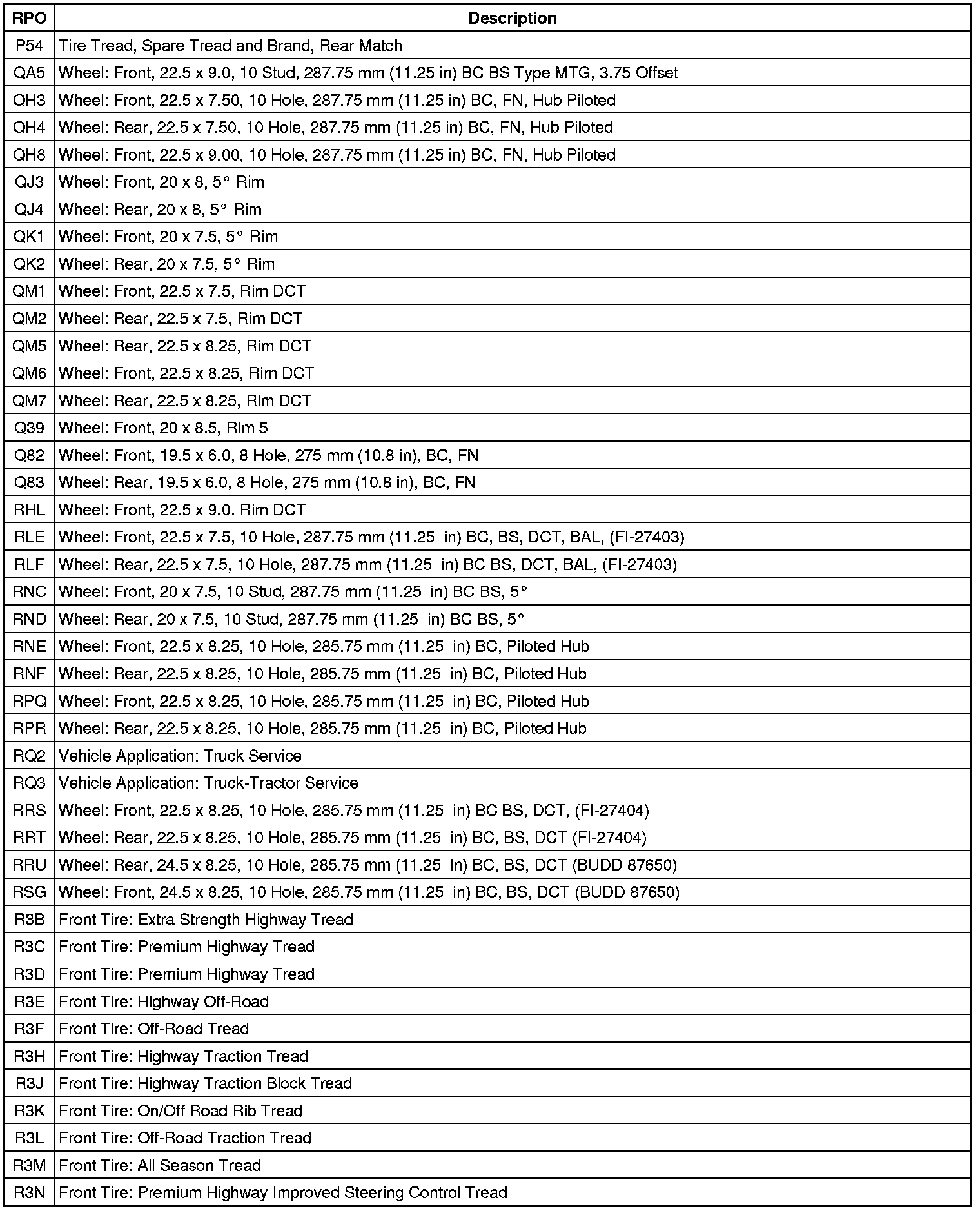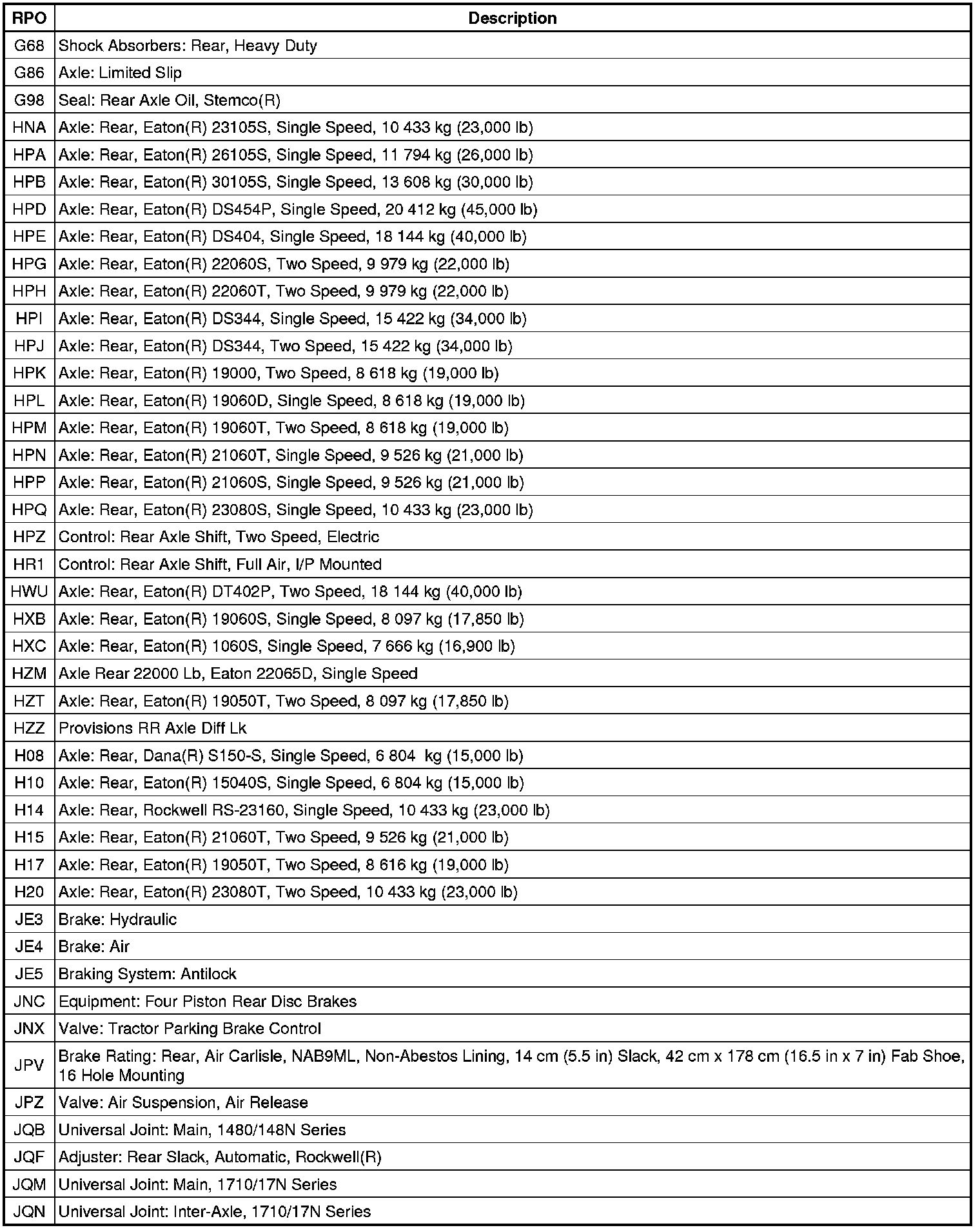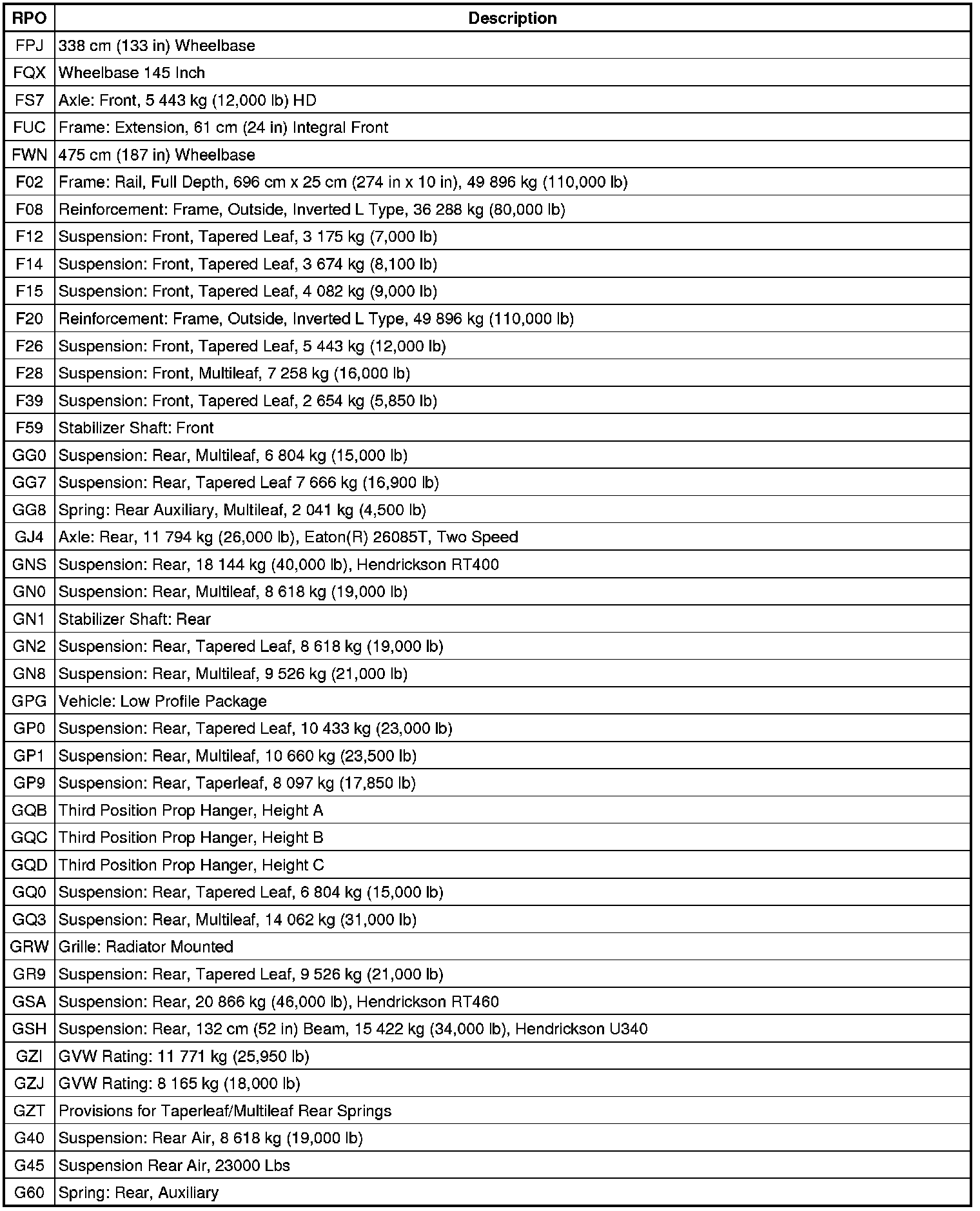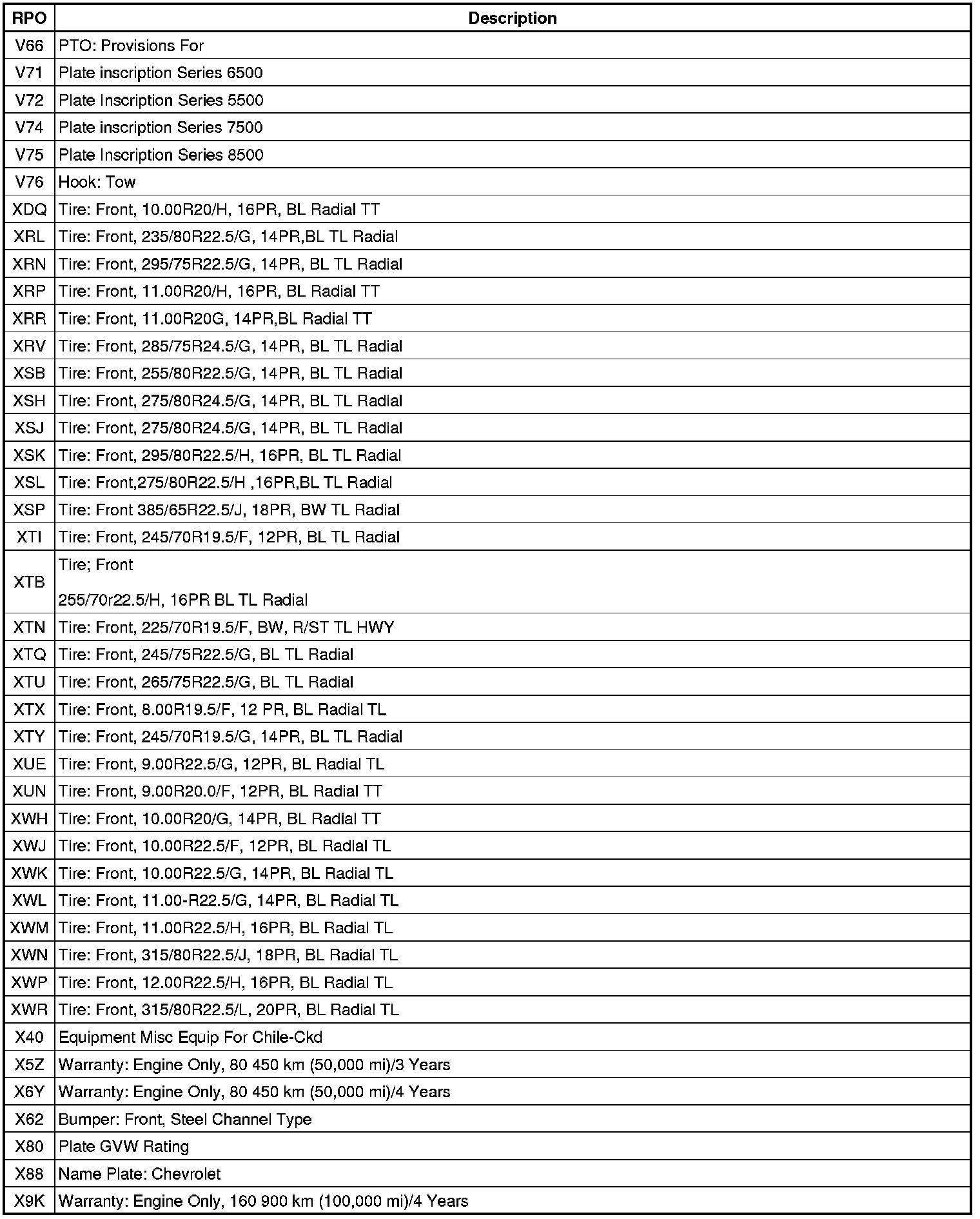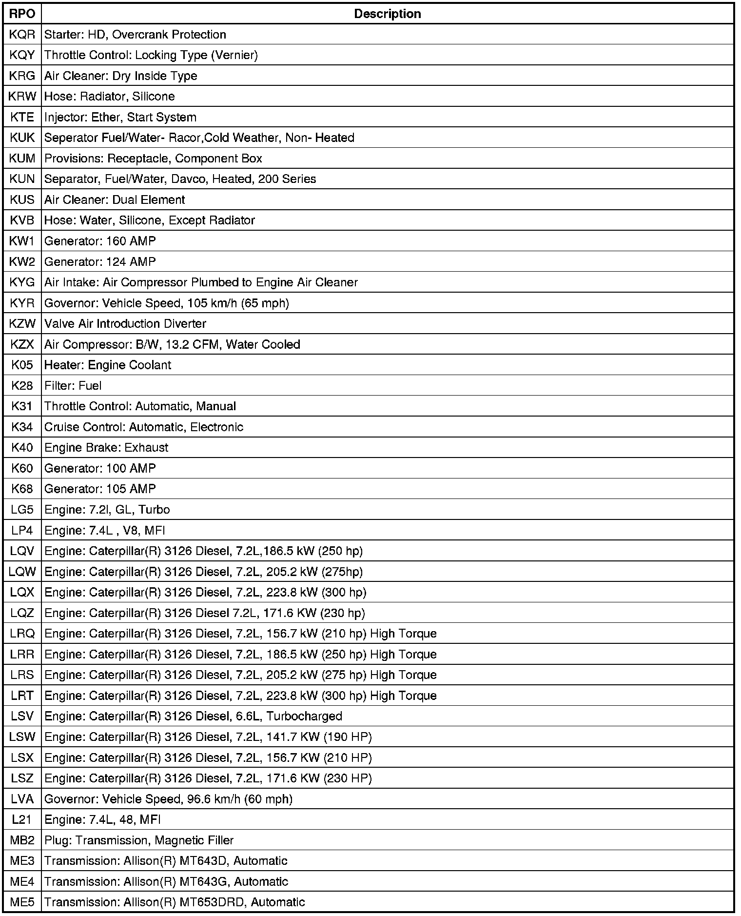 RPO Code List