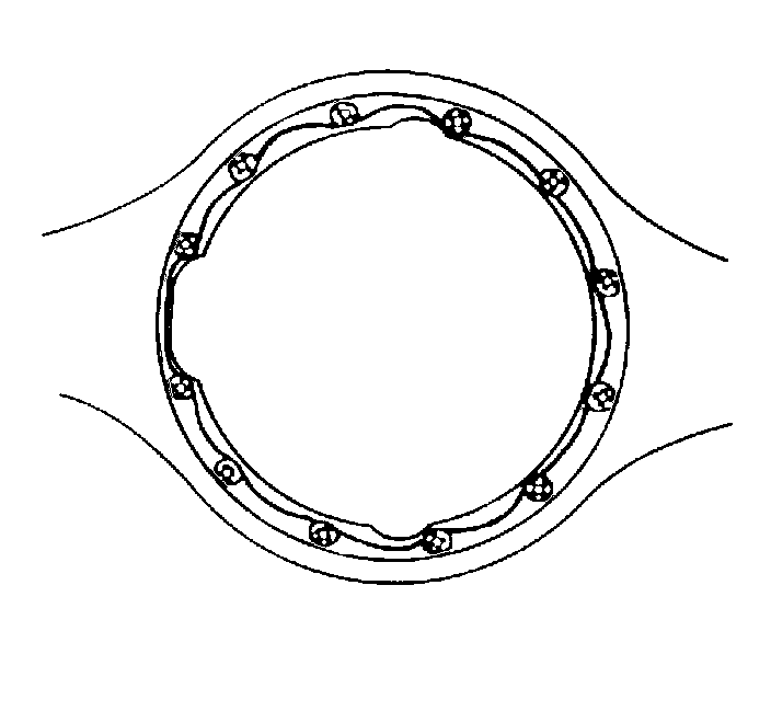 Important: Apply a 3.17 mm (0.125 in) diameter bead completely around the rear axle housing differential carrier mating surface and around each threaded hole and stud. Install the differential carrier and fasteners within 20 minutes (before the silicone sealer sets).