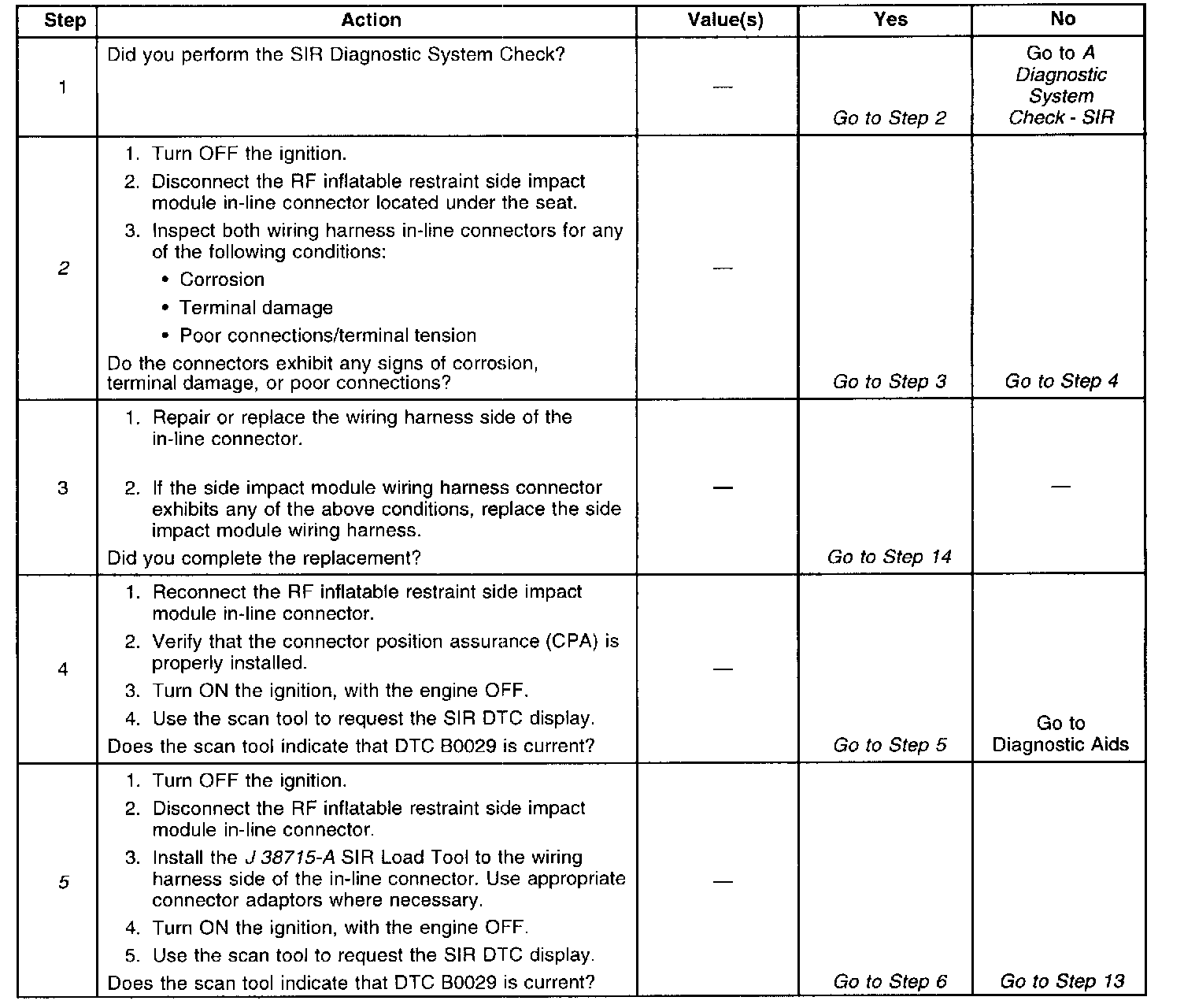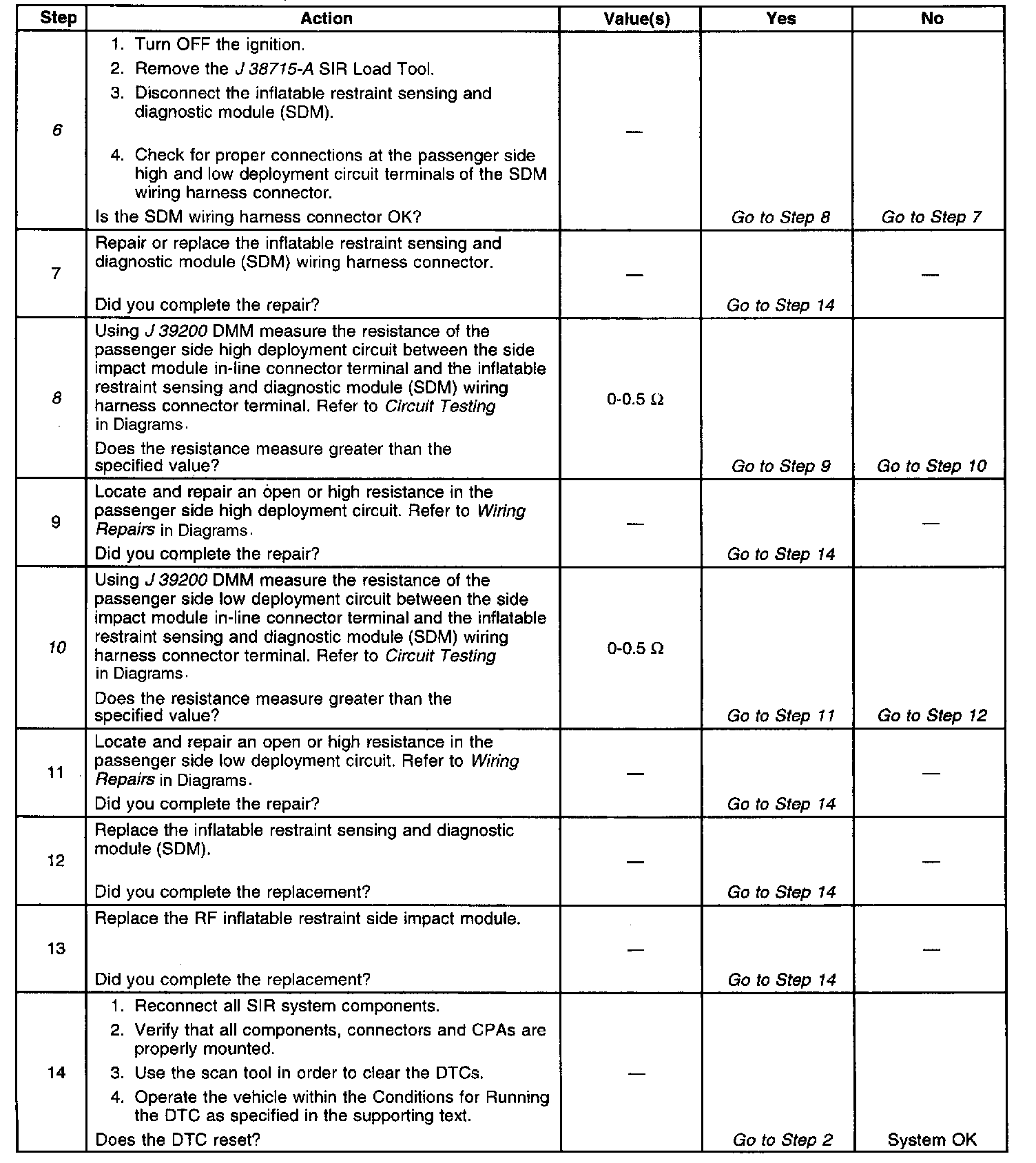 ^ The SDM detects the resistance between the passenger side high and low side deployment loop is greater than 4.8 Ohms for 500 milliseconds.