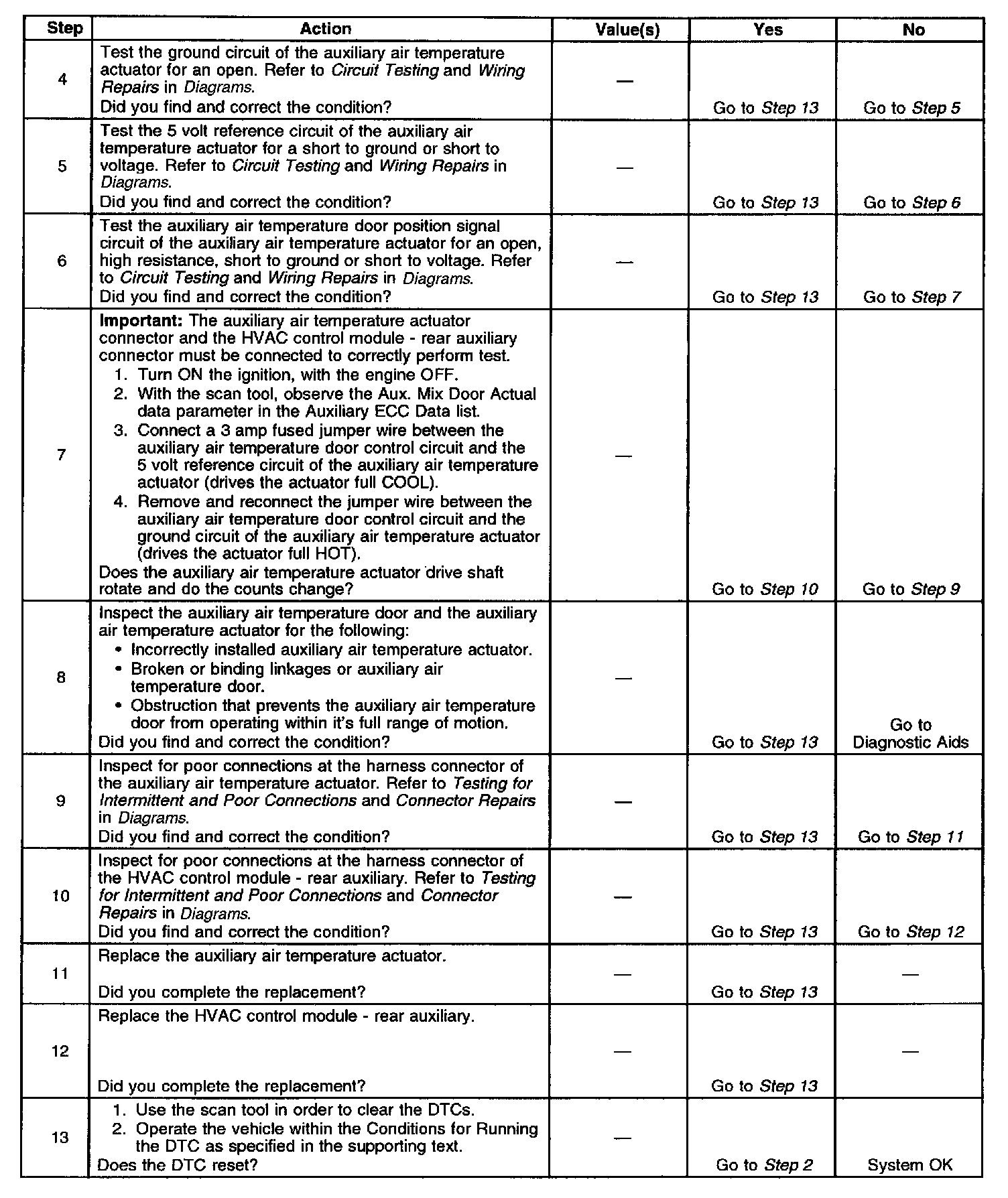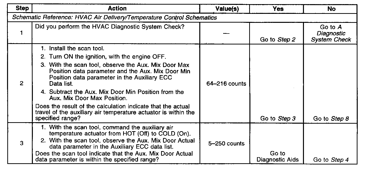 The auxiliary air temperature actuator is an electronic device that incorporates a stepper motor and feedback potentiometer. The position of the auxiliary air temperature actuator is based on the auxiliary air temperature door position signal voltage from the potentiometer. The rear auxiliary HVAC module converts this voltage to a digital signal that can be transmitted over the Keyboard Display Driver (KDD) data bus to the HVAC control module. The HVAC control module contains the logic that controls the operation of the auxiliary air temperature actuator. Whenever the HVAC control modules keep alive memory battery power is interrupted, the HVAC control module will perform a recalibration of the actuators. The HVAC control module will perform a travel range comparison of the calculated minimum and maximum extremes of the actuator to the calibrated minimum and maximum range extremes within the HVAC control module. If the calculated range does not equal the calibrated expected range the actuator will be considered not calibrated and the DTC will set. The HVAC control module will also perform a continuous test on the current feedback value. If the feedback value does not equal or fall within the calibrated range the DTC will set.