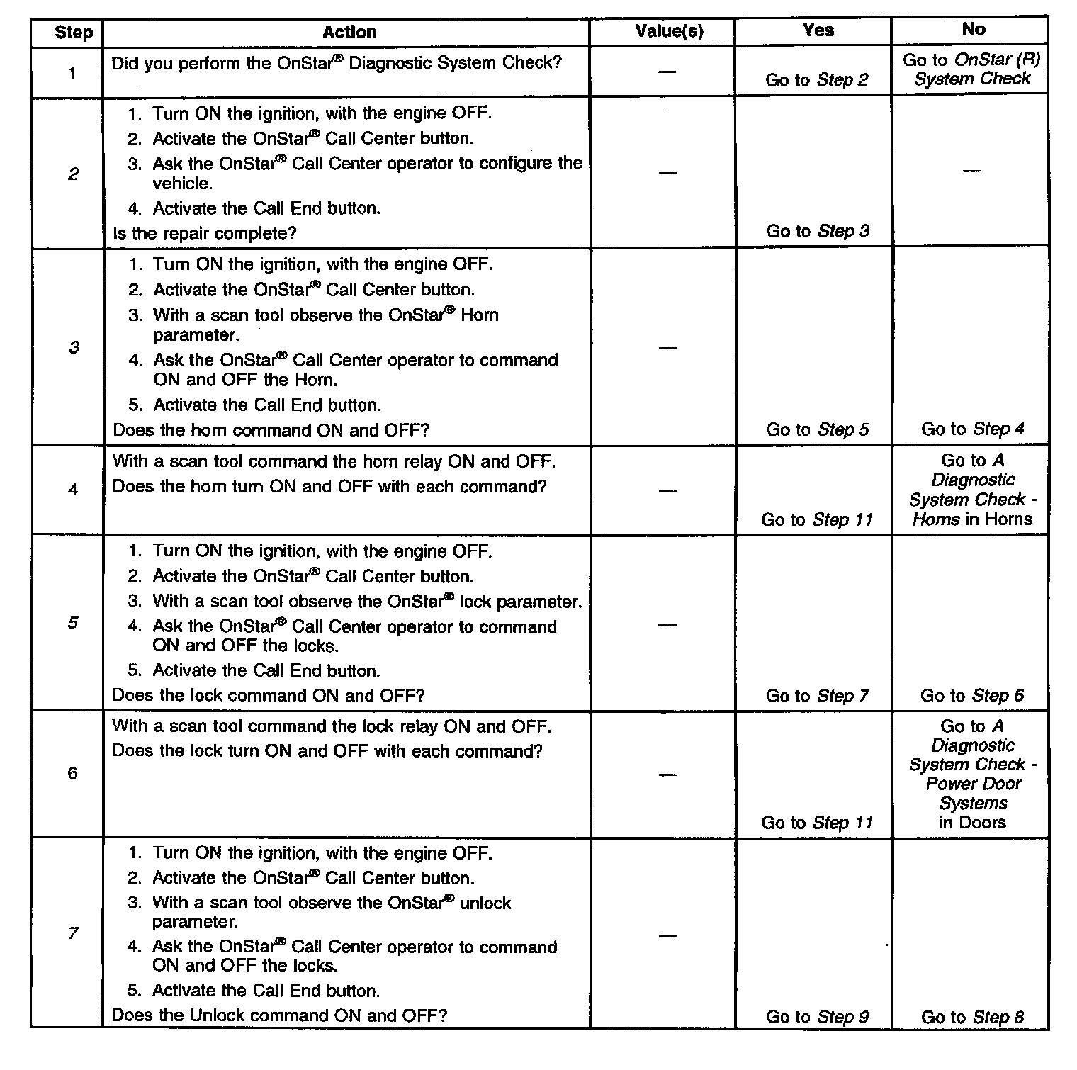 This procedure determines the problem with the OnStar(R) Center commands if they are inoperative. The vehicle must be in an area capable of transmitting and receiving cellular signals. The following numbers refer to the steps in the table.