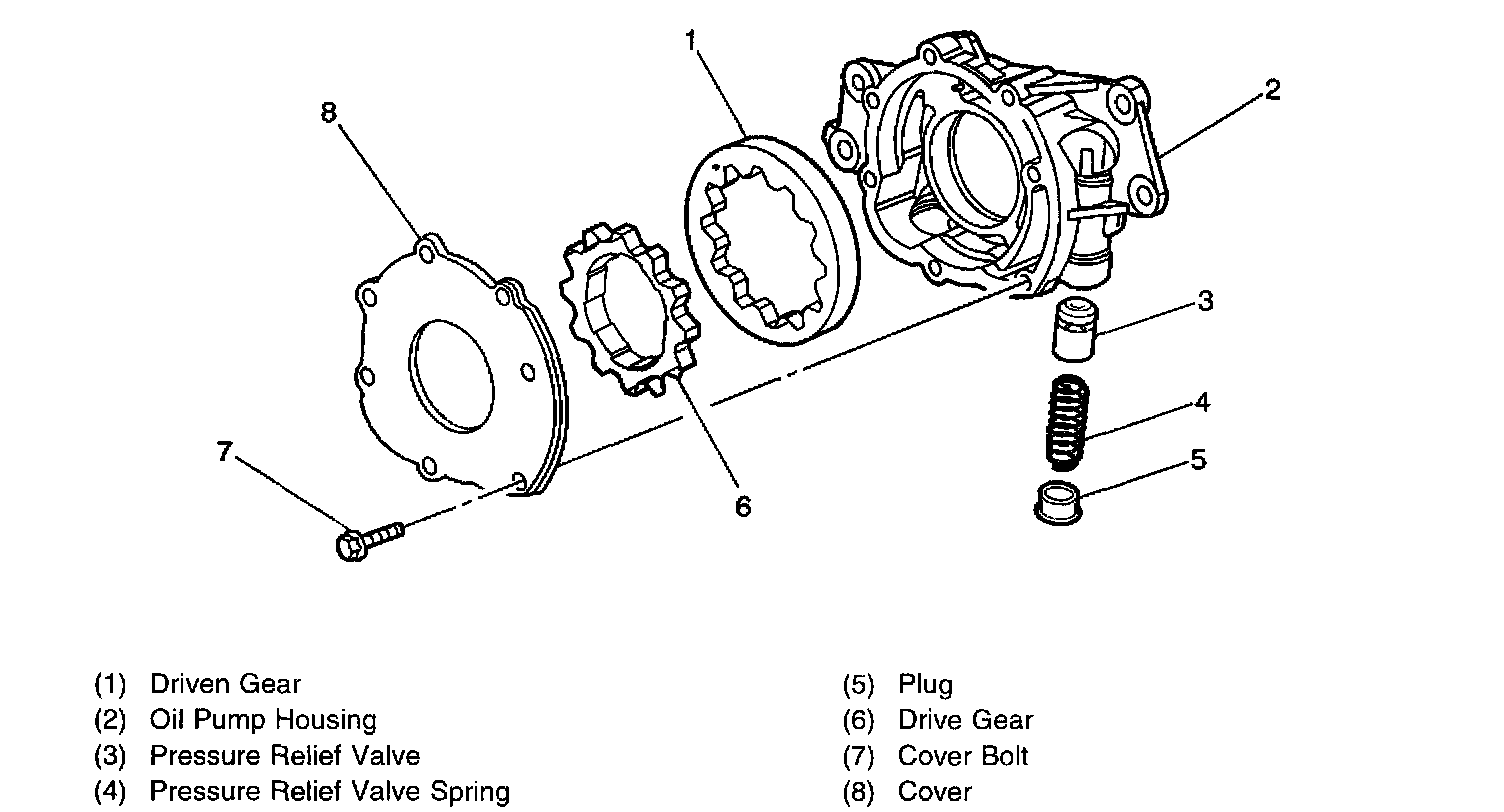 Lubrication Flow SchematicEngine lubrication is supplied by a gerotor type oil pump assembly. The pump is mounted on the front of the engine block and driven directly by the crankshaft sprocket. The pump gears rotate and draw oil from the oil pan sump through a pick-up screen and pipe. The oil is pressurized as it passes through the pump and is sent through the engine block oil galleries. Contained within the oil pump assembly is a pressure relief valve that maintains oil pressure within a specified range. Pressurized oil is directed through the lower gallery to the full flow oil filter where harmful contaminants are removed. A bypass valve is incorporated into the oil pan (at the oil filter boss) which will permit oil flow in the event the filter becomes restricted. At the rear of the block, oil is then directed to the upper main oil galleries which are drilled just above the camshaft assembly. From there oil is then directed to the crankshaft and camshaft bearings. Oil that has entered the upper main oil galleries also pressurizes the valve lifter assemblies and is then pumped through the pushrods to lubricate the valve rocker arms and valve stems. Oil returning to the pan is directed by the crankshaft oil deflector. Oil pressure and crankcase level are each monitored by individual sensors.