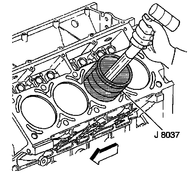 Important: The piston and cylinder bore have been measured and the bore has been sized for the proper clearance. Install the piston and connecting rod assembly into the proper cylinder bore. The piston alignment mark MUST face the front of the engine block.