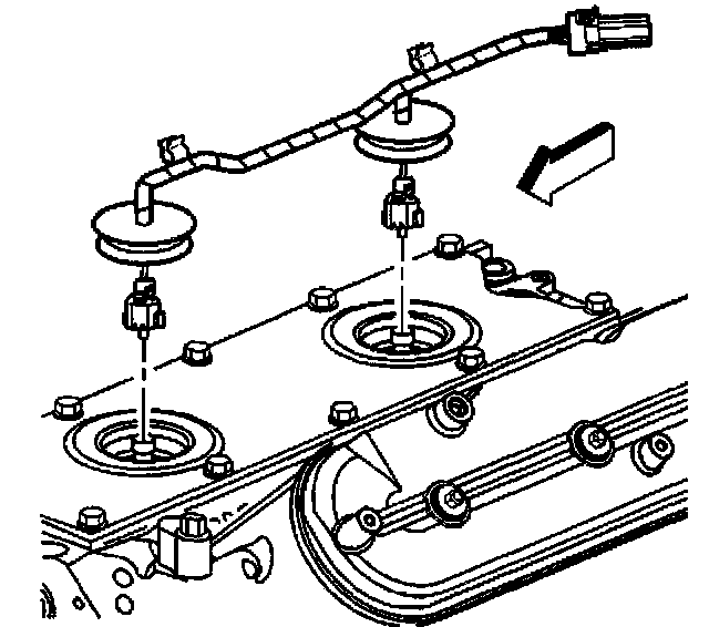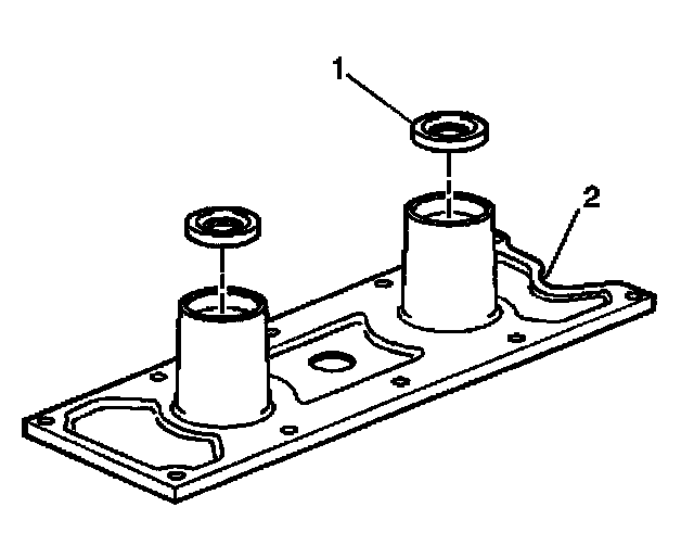 Important: All gasket surfaces should be free of oil or other foreign material during assembly.1. Install NEW knock sensor oil seals (1) into the valley cover (2). Lubricate the seal surfaces with clean engine oil.