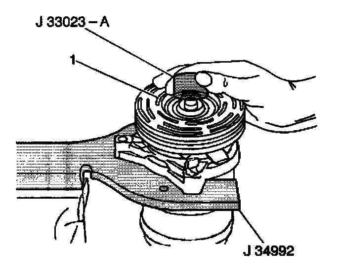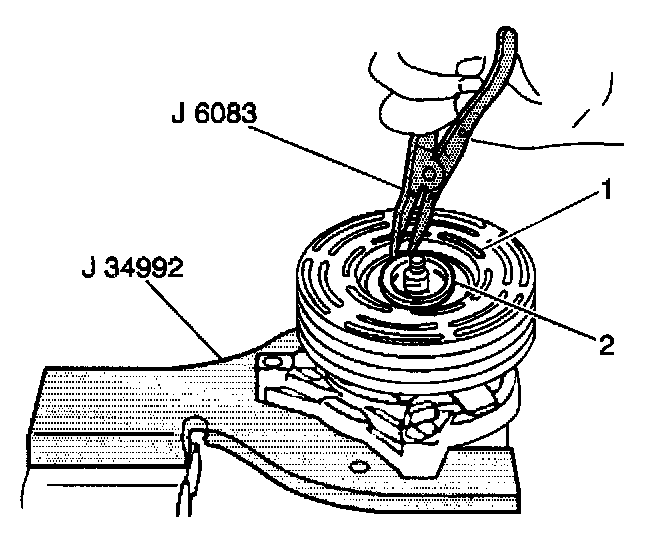 10. Tighten the J 8433-3 against the puller pilot in order to remove the clutch coil (2).