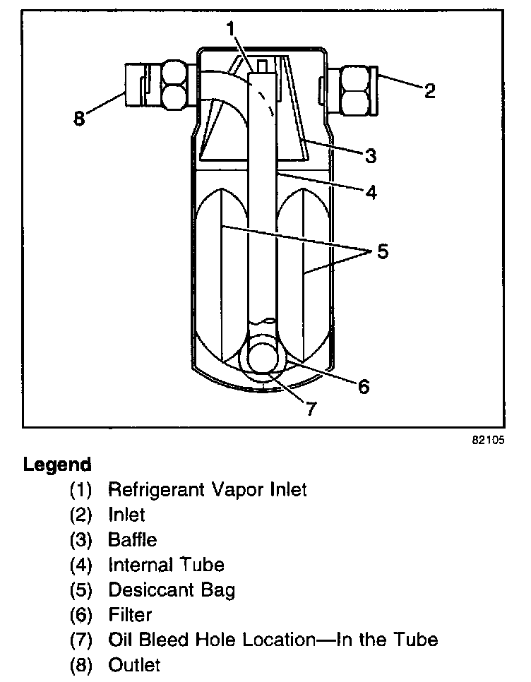 The sealed accumulator is connected to the evaporator outlet pipe. The accumulator stores the refrigerant (vapor and liquid) and the oil from the evaporator. A desiccant at the accumulator bottom dries any moisture in the system. An oil bleed hole at the accumulator outlet pipe end provides the oil return path to the compressor. The accumulator is not serviceable and should only be replaced when leaking due to the following conditions:
