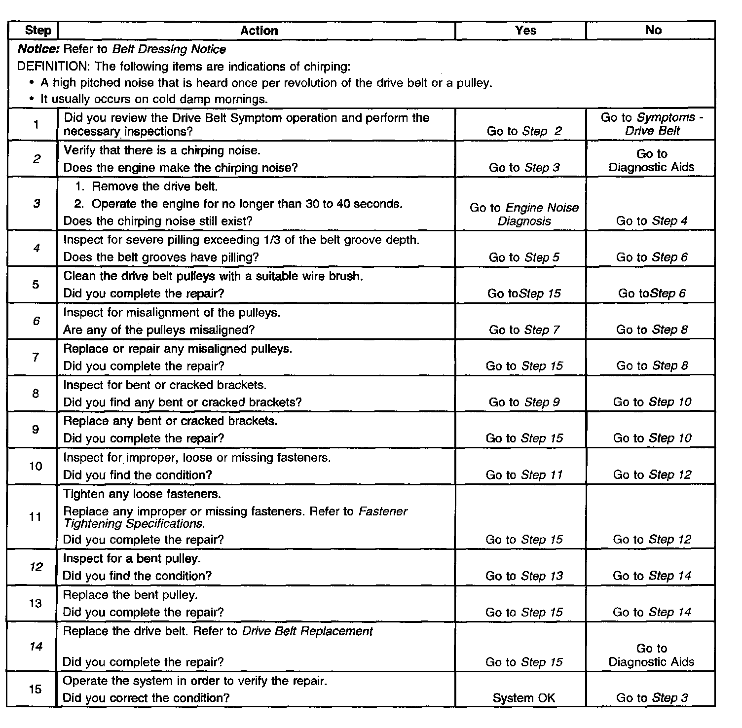 3. The noise may be an internal engine noise. Removing the drive belt and operating the engine for a brief period will verify the noise is related to the drive belt. When removing the drive belt(s) the water pump may not be operating and the engine may overheat. Also DTCs may set when the engine is operating with the drive belt removed.