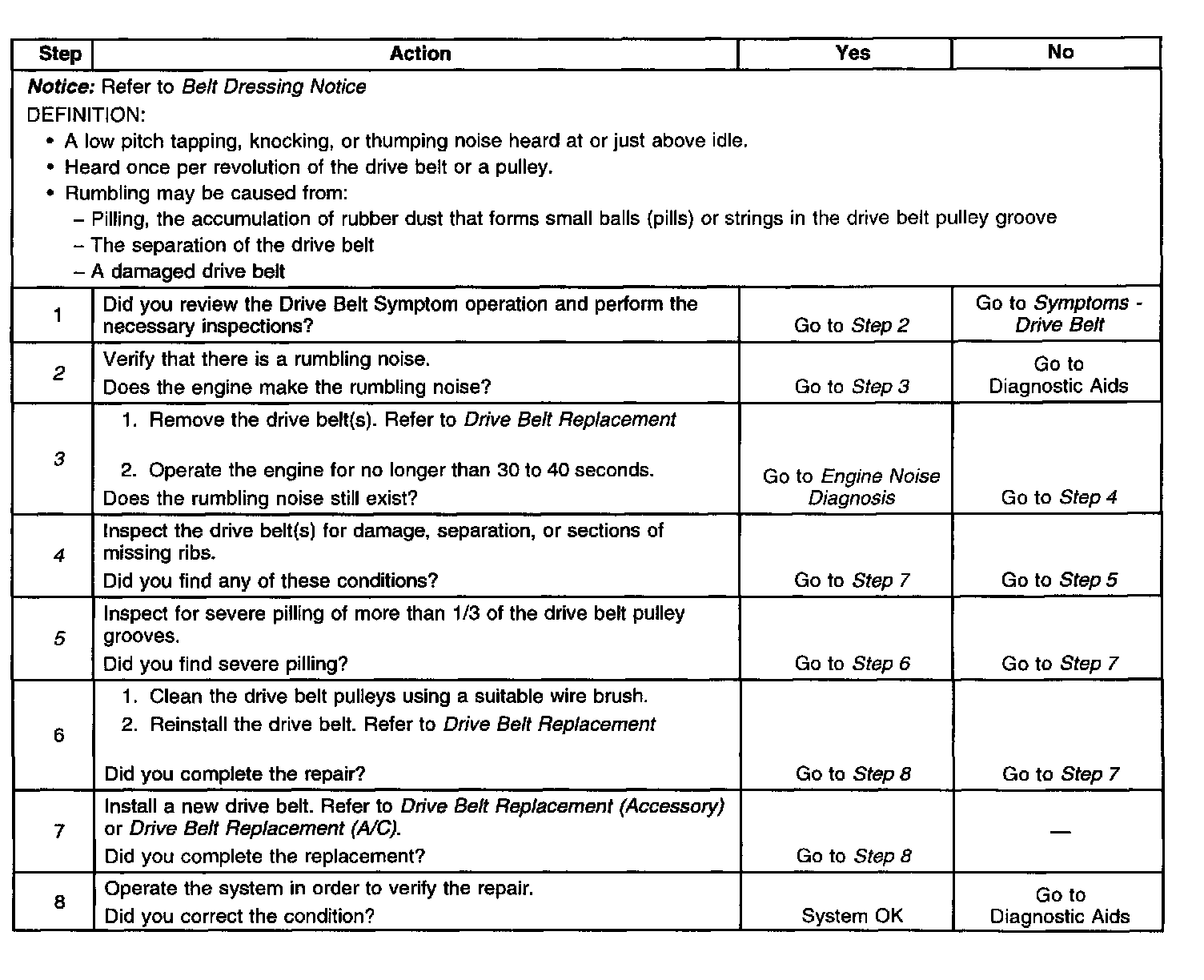 3. This test is to verify that the drive belt(s) is causing the rumbling noise. Rumbling noise may be confused with an internal engine noise due to the similarity in the description. Remove only one drive belt at a time if the vehicle has multiple drive belts. When removing the drive belt the water pump may not be operating and the engine may overheat. Also DTCs may set when the engine is operating with the drive belt removed.