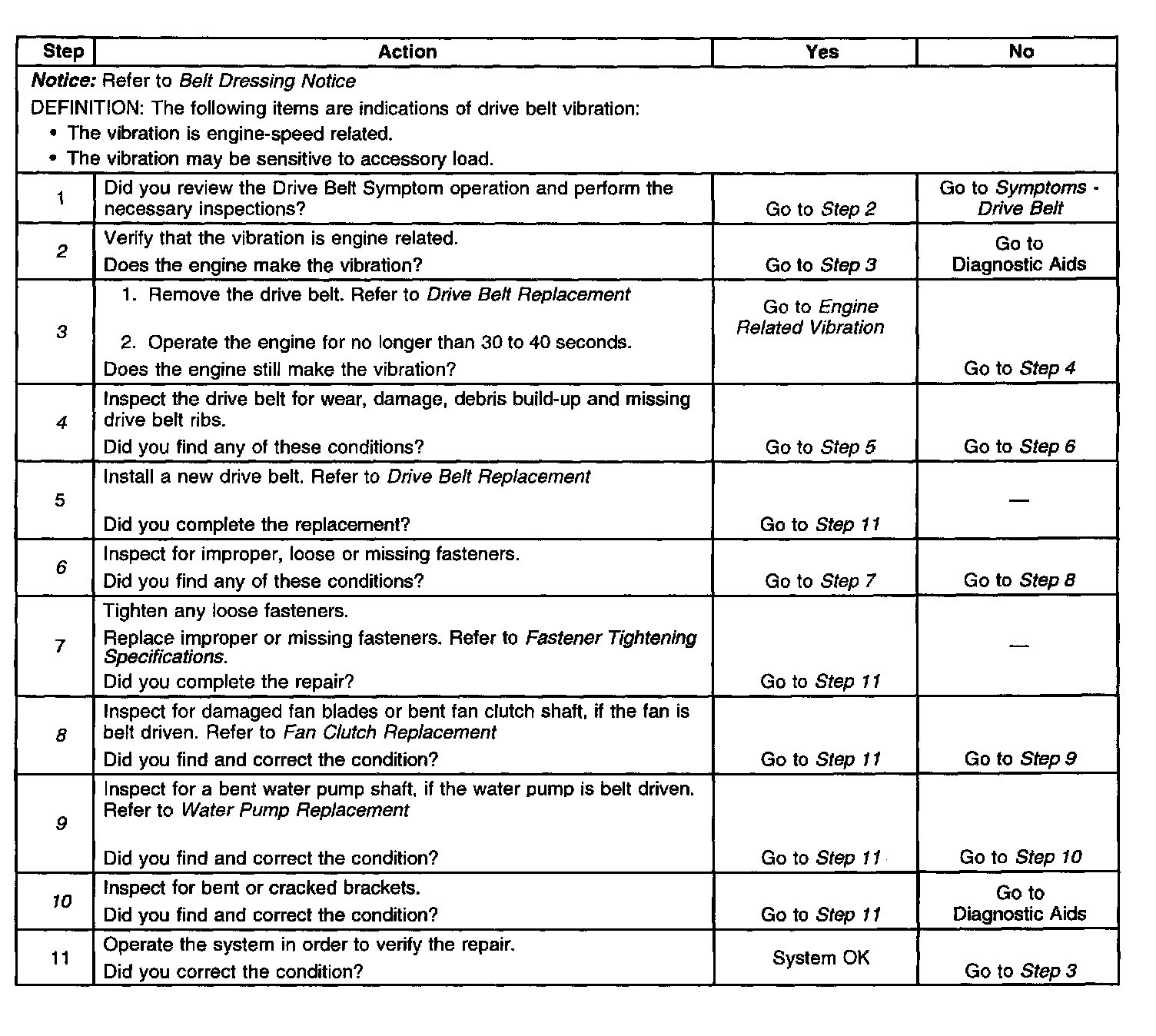 3. This test is to verify that the drive belt(s) or accessory drive components may be causing the vibration. When removing the drive belt the water pump may not be operating and the engine may overheat. Also DTCs may set when the engine is operating with the drive belt removed.