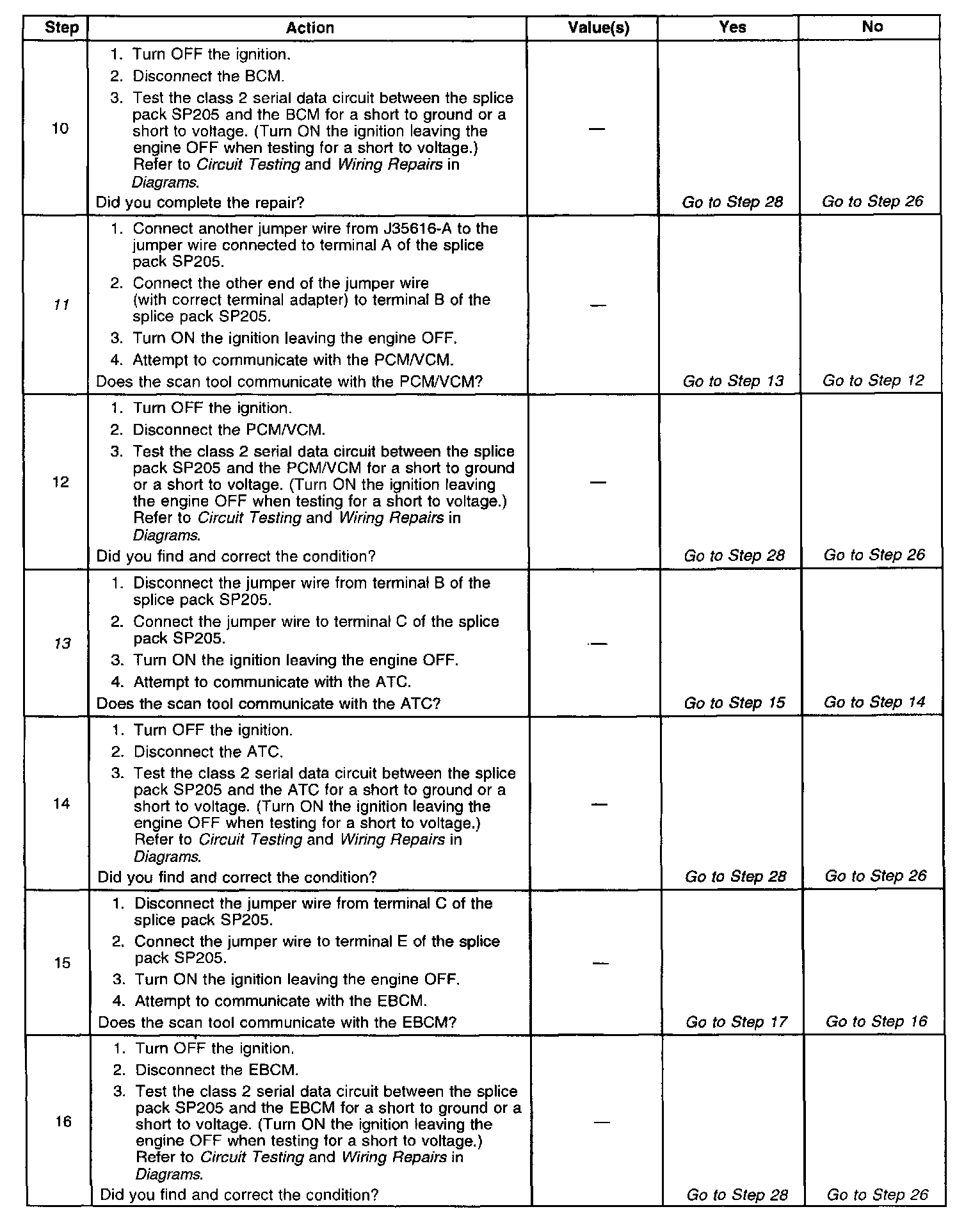 9. The class 2 serial data circuit is shorted to voltage or ground. The condition may be due to the wiring or due to a malfunction in one of the modules. When testing the wiring for a short, make sure there is not a module connected to the wire being tested. This test isolates the BCM class 2 serial data circuit.