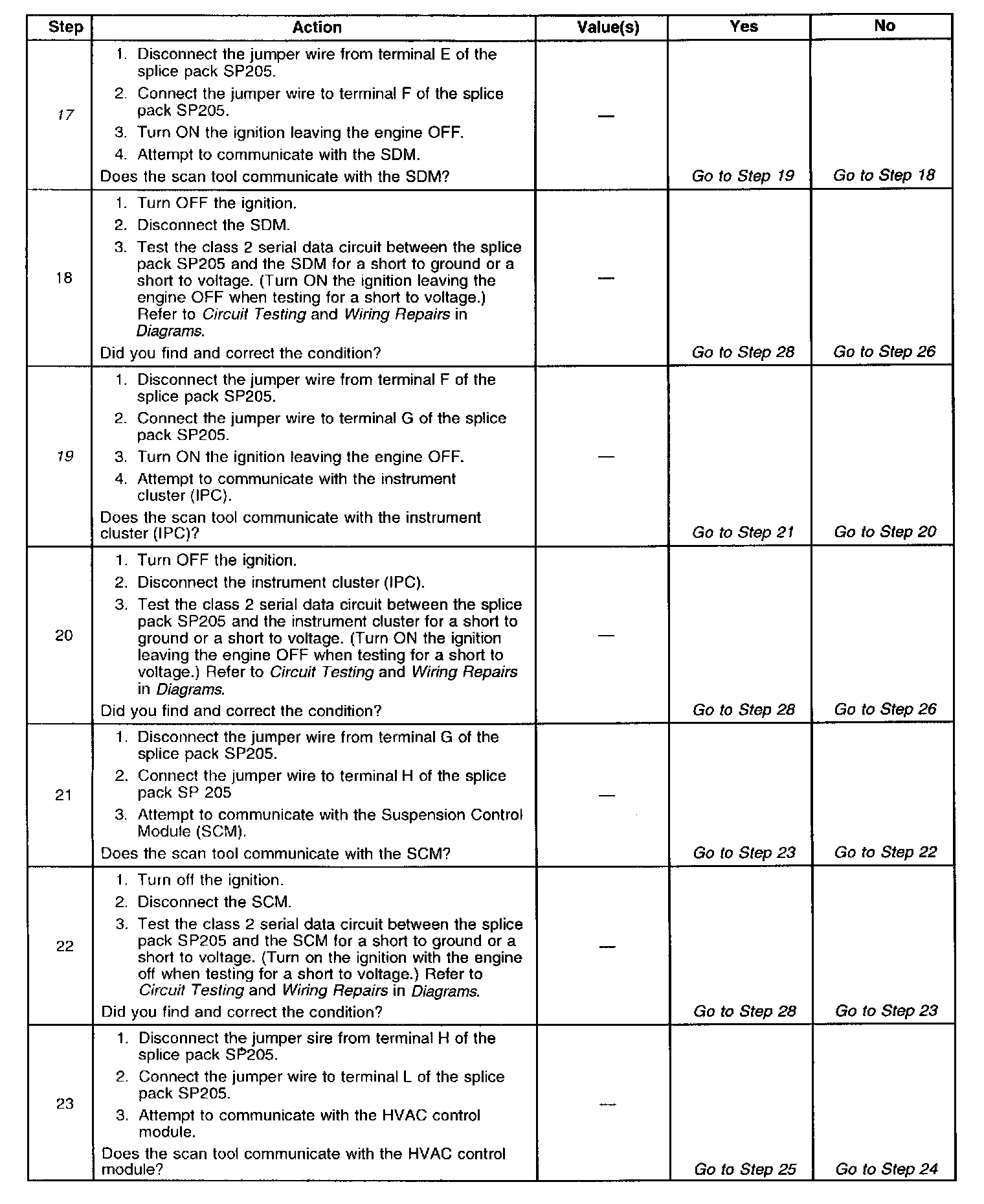 8. An open in the class 2 serial data circuit between the DLC and splice pack SP 205 will prevent the scan tool from communicating with any module. This condition will not set a DTC.