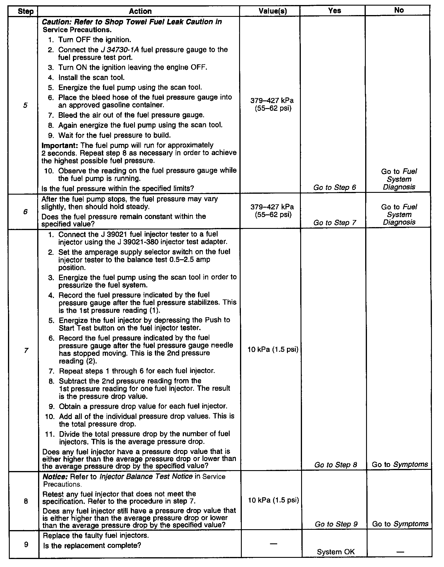 5. The fuel pressure should be within the specified range. If the fuel pressure is not within the specified range, refer to Fuel System Diagnosis. Component Tests and General Diagnostics