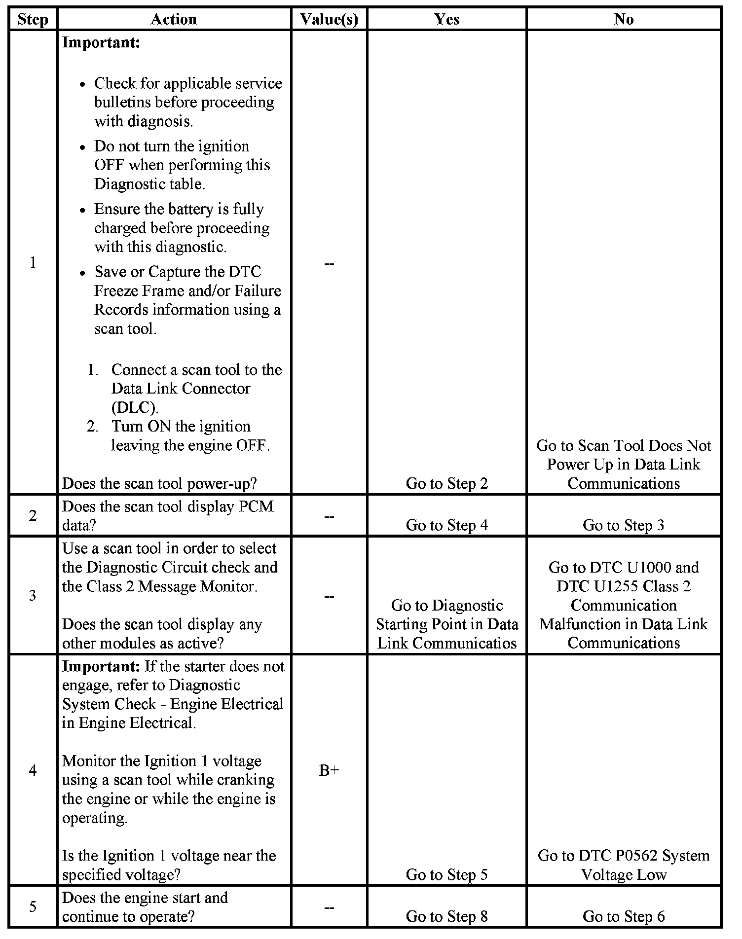The Powertrain On Board Diagnostic (OBD) System Check is an organized approach to identifying a problem created by an electronic powertrain control system malfunction. The Powertrain OBD System Check is the starting point for any driveability concern diagnosis. The Powertrain OBD System Check directs the service technician to the next logical step in diagnosing a driveability concern. Understanding and using the table correctly will reduce the diagnostic time and prevent the replacement of good parts.