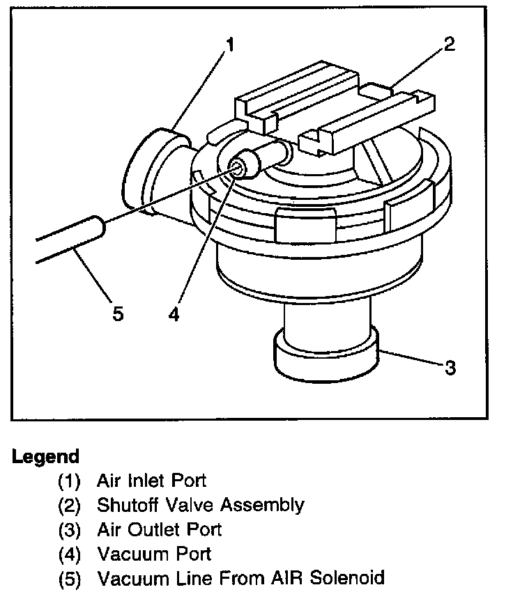 The shut off valve is a vacuum operated valve. Vacuum is allowed to the vacuum port by the solenoid. The vacuum opens the valve and allows air from the air pump into the inlet port, through the valve and then through the outlet port to the hoses and pipes.