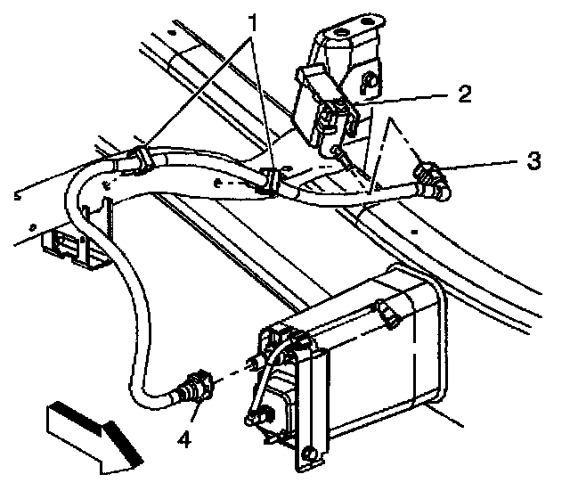 4. Install the EVAP vent pipe into the mounting clips (1).