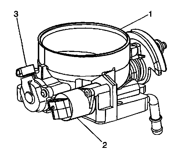 The throttle body assembly (1) attaches to the upper intake manifold. The throttle body controls the air flow into the engine, thereby controlling the engine output. The vehicle operator opens the throttle valve within the throttle body through the accelerator controls. During engine idle, the throttle valve is almost closed. A fixed air bypass orifice and the Idle Air Control (IAC) valve (2) handle the air flow control. The throttle body also provides the location for mounting the Throttle Position (TP) sensor (3).