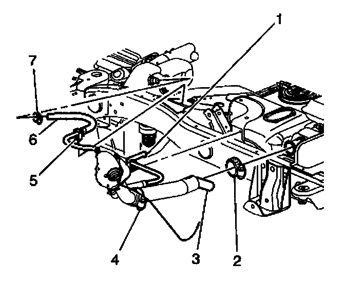 6. Disconnect the EVAP vent pipe (3) at the fuel tank clips (5).