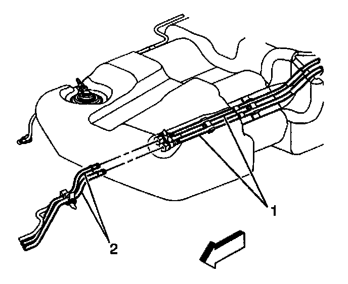 15. Connect the chassis fuel pipes (2) at the fuel tank pipes (1).