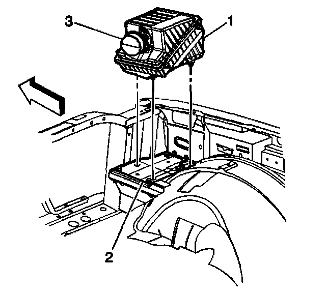 6. Pull up on the air cleaner assembly (1) to release the retainers from the air cleaner adaptor (2).