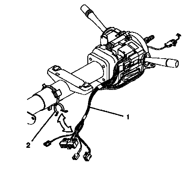 2. Remove the wire harness assembly (1) from the steering column and the wire harness strap (2).