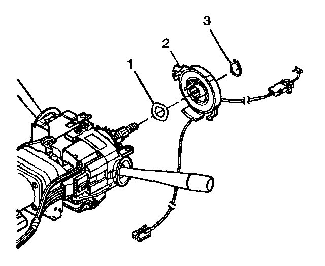 5. Remove the inflatable restraint steering wheel module coil (2) from the steering shaft assembly.