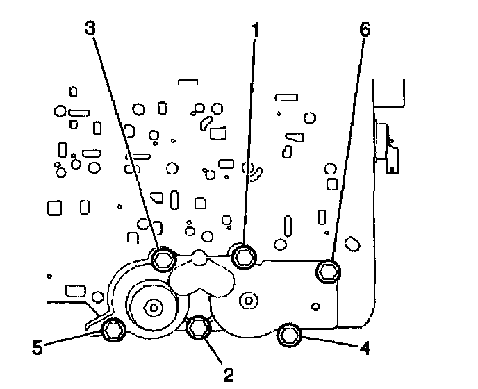 8. Install the six accumulator housing bolts (6). Start the bolts finger tight and work towards the opposite end.